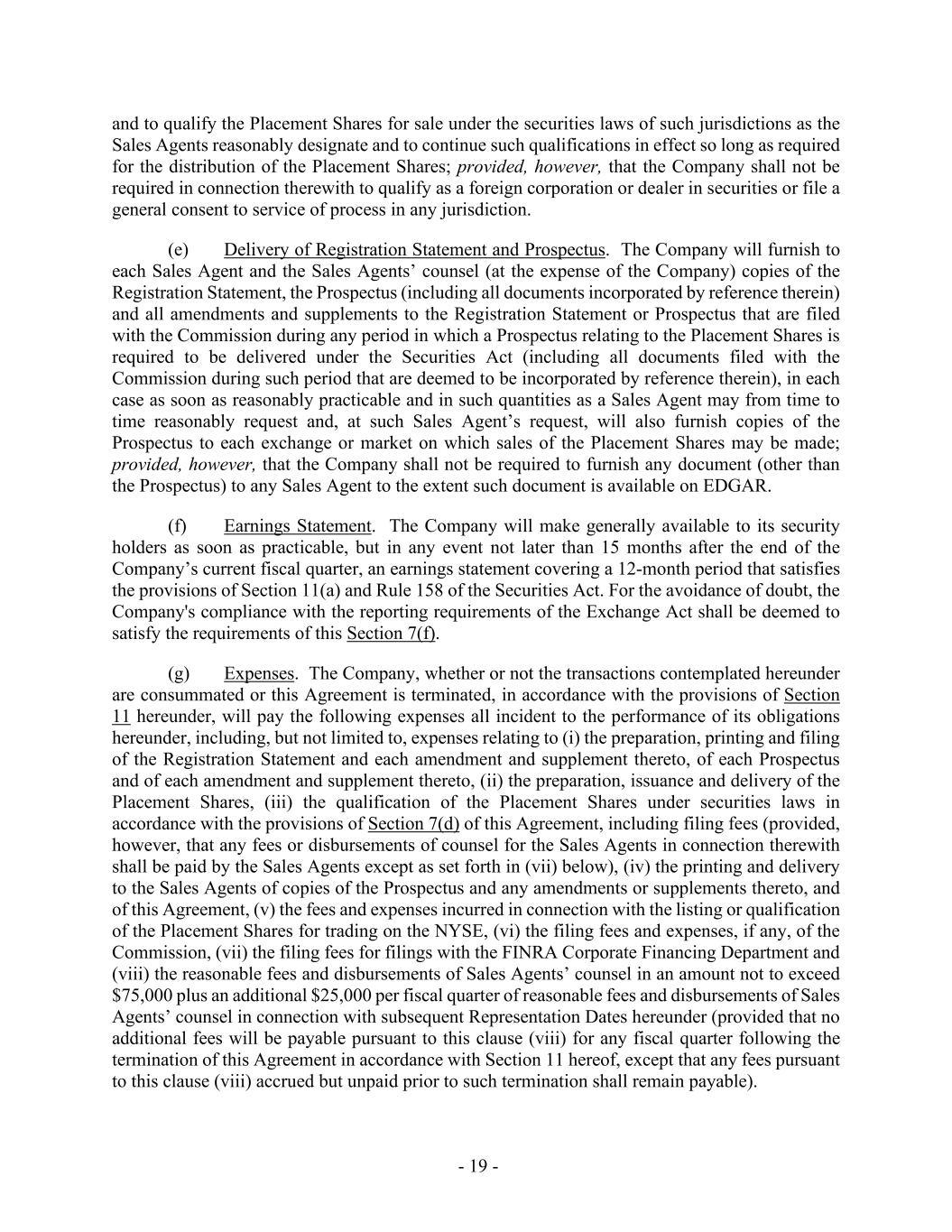 - 19 - and to qualify the Placement Shares for sale under the securities laws of such jurisdictions as the Sales Agents reasonably designate and to continue such qualifications in effect so long as required for the distribution of the Placement Shares; provided, however, that the Company shall not be required in connection therewith to qualify as a foreign corporation or dealer in securities or file a general consent to service of process in any jurisdiction. (e) Delivery of Registration Statement and Prospectus. The Company will furnish to each Sales Agent and the Sales Agents’ counsel (at the expense of the Company) copies of the Registration Statement, the Prospectus (including all documents incorporated by reference therein) and all amendments and supplements to the Registration Statement or Prospectus that are filed with the Commission during any period in which a Prospectus relating to the Placement Shares is required to be delivered under the Securities Act (including all documents filed with the Commission during such period that are deemed to be incorporated by reference therein), in each case as soon as reasonably practicable and in such quantities as a Sales Agent may from time to time reasonably request and, at such Sales Agent’s request, will also furnish copies of the Prospectus to each exchange or market on which sales of the Placement Shares may be made; provided, however, that the Company shall not be required to furnish any document (other than the Prospectus) to any Sales Agent to the extent such document is available on EDGAR. (f) Earnings Statement. The Company will make generally available to its security holders as soon as practicable, but in any event not later than 15 months after the end of the Company’s current fiscal quarter, an earnings statement covering a 12-month period that satisfies the provisions of Section 11(a) and Rule 158 of the Securities Act. For the avoidance of doubt, the Company's compliance with the reporting requirements of the Exchange Act shall be deemed to satisfy the requirements of this Section 7(f). (g) Expenses. The Company, whether or not the transactions contemplated hereunder are consummated or this Agreement is terminated, in accordance with the provisions of Section 11 hereunder, will pay the following expenses all incident to the performance of its obligations hereunder, including, but not limited to, expenses relating to (i) the preparation, printing and filing of the Registration Statement and each amendment and supplement thereto, of each Prospectus and of each amendment and supplement thereto, (ii) the preparation, issuance and delivery of the Placement Shares, (iii) the qualification of the Placement Shares under securities laws in accordance with the provisions of Section 7(d) of this Agreement, including filing fees (provided, however, that any fees or disbursements of counsel for the Sales Agents in connection therewith shall be paid by the Sales Agents except as set forth in (vii) below), (iv) the printing and delivery to the Sales Agents of copies of the Prospectus and any amendments or supplements thereto, and of this Agreement, (v) the fees and expenses incurred in connection with the listing or qualification of the Placement Shares for trading on the NYSE, (vi) the filing fees and expenses, if any, of the Commission, (vii) the filing fees for filings with the FINRA Corporate Financing Department and (viii) the reasonable fees and disbursements of Sales Agents’ counsel in an amount not to exceed $75,000 plus an additional $25,000 per fiscal quarter of reasonable fees and disbursements of Sales Agents’ counsel in connection with subsequent Representation Dates hereunder (provided that no additional fees will be payable pursuant to this clause (viii) for any fiscal quarter following the termination of this Agreement in accordance with Section 11 hereof, except that any fees pursuant to this clause (viii) accrued but unpaid prior to such termination shall remain payable).