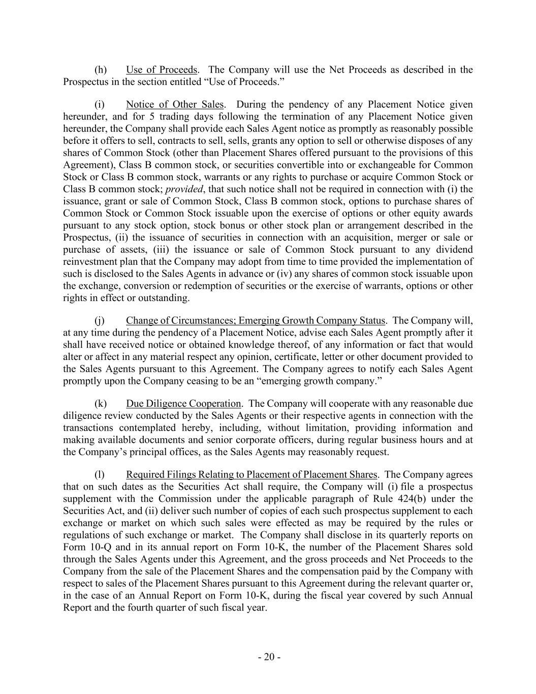 - 20 - (h) Use of Proceeds. The Company will use the Net Proceeds as described in the Prospectus in the section entitled “Use of Proceeds.” (i) Notice of Other Sales. During the pendency of any Placement Notice given hereunder, and for 5 trading days following the termination of any Placement Notice given hereunder, the Company shall provide each Sales Agent notice as promptly as reasonably possible before it offers to sell, contracts to sell, sells, grants any option to sell or otherwise disposes of any shares of Common Stock (other than Placement Shares offered pursuant to the provisions of this Agreement), Class B common stock, or securities convertible into or exchangeable for Common Stock or Class B common stock, warrants or any rights to purchase or acquire Common Stock or Class B common stock; provided, that such notice shall not be required in connection with (i) the issuance, grant or sale of Common Stock, Class B common stock, options to purchase shares of Common Stock or Common Stock issuable upon the exercise of options or other equity awards pursuant to any stock option, stock bonus or other stock plan or arrangement described in the Prospectus, (ii) the issuance of securities in connection with an acquisition, merger or sale or purchase of assets, (iii) the issuance or sale of Common Stock pursuant to any dividend reinvestment plan that the Company may adopt from time to time provided the implementation of such is disclosed to the Sales Agents in advance or (iv) any shares of common stock issuable upon the exchange, conversion or redemption of securities or the exercise of warrants, options or other rights in effect or outstanding. (j) Change of Circumstances; Emerging Growth Company Status. The Company will, at any time during the pendency of a Placement Notice, advise each Sales Agent promptly after it shall have received notice or obtained knowledge thereof, of any information or fact that would alter or affect in any material respect any opinion, certificate, letter or other document provided to the Sales Agents pursuant to this Agreement. The Company agrees to notify each Sales Agent promptly upon the Company ceasing to be an “emerging growth company.” (k) Due Diligence Cooperation. The Company will cooperate with any reasonable due diligence review conducted by the Sales Agents or their respective agents in connection with the transactions contemplated hereby, including, without limitation, providing information and making available documents and senior corporate officers, during regular business hours and at the Company’s principal offices, as the Sales Agents may reasonably request. (l) Required Filings Relating to Placement of Placement Shares. The Company agrees that on such dates as the Securities Act shall require, the Company will (i) file a prospectus supplement with the Commission under the applicable paragraph of Rule 424(b) under the Securities Act, and (ii) deliver such number of copies of each such prospectus supplement to each exchange or market on which such sales were effected as may be required by the rules or regulations of such exchange or market. The Company shall disclose in its quarterly reports on Form 10-Q and in its annual report on Form 10-K, the number of the Placement Shares sold through the Sales Agents under this Agreement, and the gross proceeds and Net Proceeds to the Company from the sale of the Placement Shares and the compensation paid by the Company with respect to sales of the Placement Shares pursuant to this Agreement during the relevant quarter or, in the case of an Annual Report on Form 10-K, during the fiscal year covered by such Annual Report and the fourth quarter of such fiscal year.