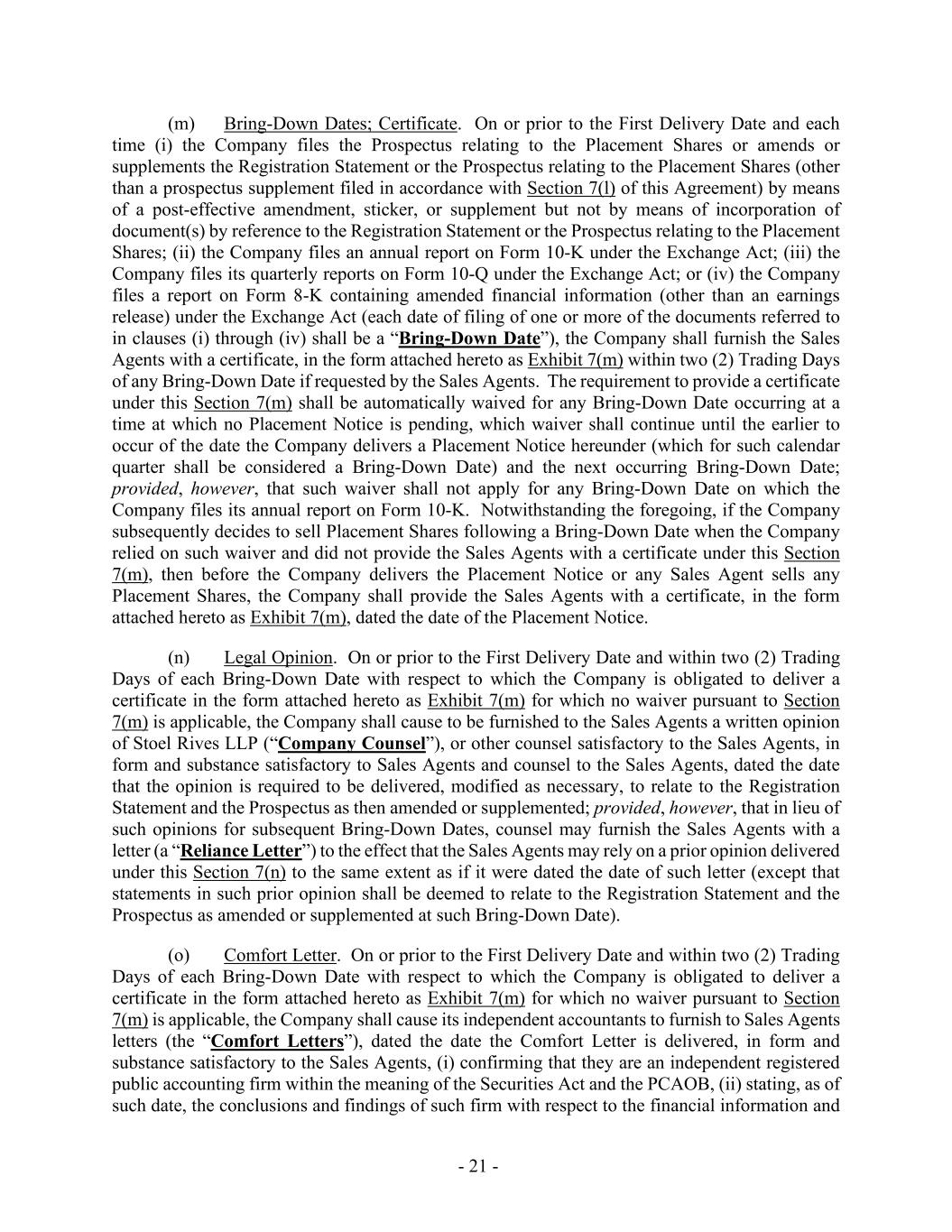- 21 - (m) Bring-Down Dates; Certificate. On or prior to the First Delivery Date and each time (i) the Company files the Prospectus relating to the Placement Shares or amends or supplements the Registration Statement or the Prospectus relating to the Placement Shares (other than a prospectus supplement filed in accordance with Section 7(l) of this Agreement) by means of a post-effective amendment, sticker, or supplement but not by means of incorporation of document(s) by reference to the Registration Statement or the Prospectus relating to the Placement Shares; (ii) the Company files an annual report on Form 10-K under the Exchange Act; (iii) the Company files its quarterly reports on Form 10-Q under the Exchange Act; or (iv) the Company files a report on Form 8-K containing amended financial information (other than an earnings release) under the Exchange Act (each date of filing of one or more of the documents referred to in clauses (i) through (iv) shall be a “Bring-Down Date”), the Company shall furnish the Sales Agents with a certificate, in the form attached hereto as Exhibit 7(m) within two (2) Trading Days of any Bring-Down Date if requested by the Sales Agents. The requirement to provide a certificate under this Section 7(m) shall be automatically waived for any Bring-Down Date occurring at a time at which no Placement Notice is pending, which waiver shall continue until the earlier to occur of the date the Company delivers a Placement Notice hereunder (which for such calendar quarter shall be considered a Bring-Down Date) and the next occurring Bring-Down Date; provided, however, that such waiver shall not apply for any Bring-Down Date on which the Company files its annual report on Form 10-K. Notwithstanding the foregoing, if the Company subsequently decides to sell Placement Shares following a Bring-Down Date when the Company relied on such waiver and did not provide the Sales Agents with a certificate under this Section 7(m), then before the Company delivers the Placement Notice or any Sales Agent sells any Placement Shares, the Company shall provide the Sales Agents with a certificate, in the form attached hereto as Exhibit 7(m), dated the date of the Placement Notice. (n) Legal Opinion. On or prior to the First Delivery Date and within two (2) Trading Days of each Bring-Down Date with respect to which the Company is obligated to deliver a certificate in the form attached hereto as Exhibit 7(m) for which no waiver pursuant to Section 7(m) is applicable, the Company shall cause to be furnished to the Sales Agents a written opinion of Stoel Rives LLP (“Company Counsel”), or other counsel satisfactory to the Sales Agents, in form and substance satisfactory to Sales Agents and counsel to the Sales Agents, dated the date that the opinion is required to be delivered, modified as necessary, to relate to the Registration Statement and the Prospectus as then amended or supplemented; provided, however, that in lieu of such opinions for subsequent Bring-Down Dates, counsel may furnish the Sales Agents with a letter (a “Reliance Letter”) to the effect that the Sales Agents may rely on a prior opinion delivered under this Section 7(n) to the same extent as if it were dated the date of such letter (except that statements in such prior opinion shall be deemed to relate to the Registration Statement and the Prospectus as amended or supplemented at such Bring-Down Date). (o) Comfort Letter. On or prior to the First Delivery Date and within two (2) Trading Days of each Bring-Down Date with respect to which the Company is obligated to deliver a certificate in the form attached hereto as Exhibit 7(m) for which no waiver pursuant to Section 7(m) is applicable, the Company shall cause its independent accountants to furnish to Sales Agents letters (the “Comfort Letters”), dated the date the Comfort Letter is delivered, in form and substance satisfactory to the Sales Agents, (i) confirming that they are an independent registered public accounting firm within the meaning of the Securities Act and the PCAOB, (ii) stating, as of such date, the conclusions and findings of such firm with respect to the financial information and