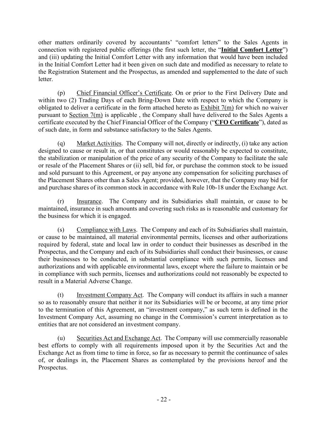 - 22 - other matters ordinarily covered by accountants’ “comfort letters” to the Sales Agents in connection with registered public offerings (the first such letter, the “Initial Comfort Letter”) and (iii) updating the Initial Comfort Letter with any information that would have been included in the Initial Comfort Letter had it been given on such date and modified as necessary to relate to the Registration Statement and the Prospectus, as amended and supplemented to the date of such letter. (p) Chief Financial Officer’s Certificate. On or prior to the First Delivery Date and within two (2) Trading Days of each Bring-Down Date with respect to which the Company is obligated to deliver a certificate in the form attached hereto as Exhibit 7(m) for which no waiver pursuant to Section 7(m) is applicable , the Company shall have delivered to the Sales Agents a certificate executed by the Chief Financial Officer of the Company (“CFO Certificate”), dated as of such date, in form and substance satisfactory to the Sales Agents. (q) Market Activities. The Company will not, directly or indirectly, (i) take any action designed to cause or result in, or that constitutes or would reasonably be expected to constitute, the stabilization or manipulation of the price of any security of the Company to facilitate the sale or resale of the Placement Shares or (ii) sell, bid for, or purchase the common stock to be issued and sold pursuant to this Agreement, or pay anyone any compensation for soliciting purchases of the Placement Shares other than a Sales Agent; provided, however, that the Company may bid for and purchase shares of its common stock in accordance with Rule 10b-18 under the Exchange Act. (r) Insurance. The Company and its Subsidiaries shall maintain, or cause to be maintained, insurance in such amounts and covering such risks as is reasonable and customary for the business for which it is engaged. (s) Compliance with Laws. The Company and each of its Subsidiaries shall maintain, or cause to be maintained, all material environmental permits, licenses and other authorizations required by federal, state and local law in order to conduct their businesses as described in the Prospectus, and the Company and each of its Subsidiaries shall conduct their businesses, or cause their businesses to be conducted, in substantial compliance with such permits, licenses and authorizations and with applicable environmental laws, except where the failure to maintain or be in compliance with such permits, licenses and authorizations could not reasonably be expected to result in a Material Adverse Change. (t) Investment Company Act. The Company will conduct its affairs in such a manner so as to reasonably ensure that neither it nor its Subsidiaries will be or become, at any time prior to the termination of this Agreement, an “investment company,” as such term is defined in the Investment Company Act, assuming no change in the Commission’s current interpretation as to entities that are not considered an investment company. (u) Securities Act and Exchange Act. The Company will use commercially reasonable best efforts to comply with all requirements imposed upon it by the Securities Act and the Exchange Act as from time to time in force, so far as necessary to permit the continuance of sales of, or dealings in, the Placement Shares as contemplated by the provisions hereof and the Prospectus.
