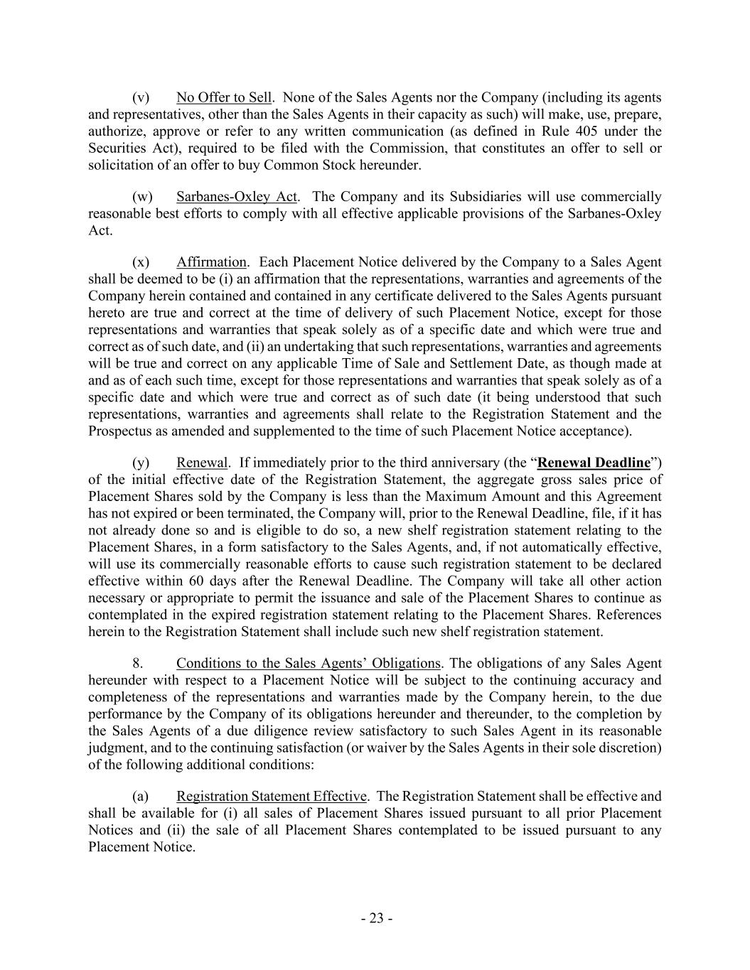 - 23 - (v) No Offer to Sell. None of the Sales Agents nor the Company (including its agents and representatives, other than the Sales Agents in their capacity as such) will make, use, prepare, authorize, approve or refer to any written communication (as defined in Rule 405 under the Securities Act), required to be filed with the Commission, that constitutes an offer to sell or solicitation of an offer to buy Common Stock hereunder. (w) Sarbanes-Oxley Act. The Company and its Subsidiaries will use commercially reasonable best efforts to comply with all effective applicable provisions of the Sarbanes-Oxley Act. (x) Affirmation. Each Placement Notice delivered by the Company to a Sales Agent shall be deemed to be (i) an affirmation that the representations, warranties and agreements of the Company herein contained and contained in any certificate delivered to the Sales Agents pursuant hereto are true and correct at the time of delivery of such Placement Notice, except for those representations and warranties that speak solely as of a specific date and which were true and correct as of such date, and (ii) an undertaking that such representations, warranties and agreements will be true and correct on any applicable Time of Sale and Settlement Date, as though made at and as of each such time, except for those representations and warranties that speak solely as of a specific date and which were true and correct as of such date (it being understood that such representations, warranties and agreements shall relate to the Registration Statement and the Prospectus as amended and supplemented to the time of such Placement Notice acceptance). (y) Renewal. If immediately prior to the third anniversary (the “Renewal Deadline”) of the initial effective date of the Registration Statement, the aggregate gross sales price of Placement Shares sold by the Company is less than the Maximum Amount and this Agreement has not expired or been terminated, the Company will, prior to the Renewal Deadline, file, if it has not already done so and is eligible to do so, a new shelf registration statement relating to the Placement Shares, in a form satisfactory to the Sales Agents, and, if not automatically effective, will use its commercially reasonable efforts to cause such registration statement to be declared effective within 60 days after the Renewal Deadline. The Company will take all other action necessary or appropriate to permit the issuance and sale of the Placement Shares to continue as contemplated in the expired registration statement relating to the Placement Shares. References herein to the Registration Statement shall include such new shelf registration statement. 8. Conditions to the Sales Agents’ Obligations. The obligations of any Sales Agent hereunder with respect to a Placement Notice will be subject to the continuing accuracy and completeness of the representations and warranties made by the Company herein, to the due performance by the Company of its obligations hereunder and thereunder, to the completion by the Sales Agents of a due diligence review satisfactory to such Sales Agent in its reasonable judgment, and to the continuing satisfaction (or waiver by the Sales Agents in their sole discretion) of the following additional conditions: (a) Registration Statement Effective. The Registration Statement shall be effective and shall be available for (i) all sales of Placement Shares issued pursuant to all prior Placement Notices and (ii) the sale of all Placement Shares contemplated to be issued pursuant to any Placement Notice.