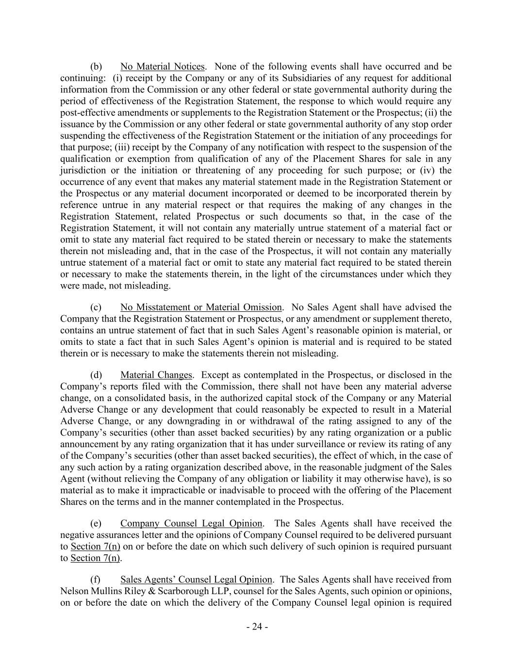 - 24 - (b) No Material Notices. None of the following events shall have occurred and be continuing: (i) receipt by the Company or any of its Subsidiaries of any request for additional information from the Commission or any other federal or state governmental authority during the period of effectiveness of the Registration Statement, the response to which would require any post-effective amendments or supplements to the Registration Statement or the Prospectus; (ii) the issuance by the Commission or any other federal or state governmental authority of any stop order suspending the effectiveness of the Registration Statement or the initiation of any proceedings for that purpose; (iii) receipt by the Company of any notification with respect to the suspension of the qualification or exemption from qualification of any of the Placement Shares for sale in any jurisdiction or the initiation or threatening of any proceeding for such purpose; or (iv) the occurrence of any event that makes any material statement made in the Registration Statement or the Prospectus or any material document incorporated or deemed to be incorporated therein by reference untrue in any material respect or that requires the making of any changes in the Registration Statement, related Prospectus or such documents so that, in the case of the Registration Statement, it will not contain any materially untrue statement of a material fact or omit to state any material fact required to be stated therein or necessary to make the statements therein not misleading and, that in the case of the Prospectus, it will not contain any materially untrue statement of a material fact or omit to state any material fact required to be stated therein or necessary to make the statements therein, in the light of the circumstances under which they were made, not misleading. (c) No Misstatement or Material Omission. No Sales Agent shall have advised the Company that the Registration Statement or Prospectus, or any amendment or supplement thereto, contains an untrue statement of fact that in such Sales Agent’s reasonable opinion is material, or omits to state a fact that in such Sales Agent’s opinion is material and is required to be stated therein or is necessary to make the statements therein not misleading. (d) Material Changes. Except as contemplated in the Prospectus, or disclosed in the Company’s reports filed with the Commission, there shall not have been any material adverse change, on a consolidated basis, in the authorized capital stock of the Company or any Material Adverse Change or any development that could reasonably be expected to result in a Material Adverse Change, or any downgrading in or withdrawal of the rating assigned to any of the Company’s securities (other than asset backed securities) by any rating organization or a public announcement by any rating organization that it has under surveillance or review its rating of any of the Company’s securities (other than asset backed securities), the effect of which, in the case of any such action by a rating organization described above, in the reasonable judgment of the Sales Agent (without relieving the Company of any obligation or liability it may otherwise have), is so material as to make it impracticable or inadvisable to proceed with the offering of the Placement Shares on the terms and in the manner contemplated in the Prospectus. (e) Company Counsel Legal Opinion. The Sales Agents shall have received the negative assurances letter and the opinions of Company Counsel required to be delivered pursuant to Section 7(n) on or before the date on which such delivery of such opinion is required pursuant to Section 7(n). (f) Sales Agents’ Counsel Legal Opinion. The Sales Agents shall have received from Nelson Mullins Riley & Scarborough LLP, counsel for the Sales Agents, such opinion or opinions, on or before the date on which the delivery of the Company Counsel legal opinion is required