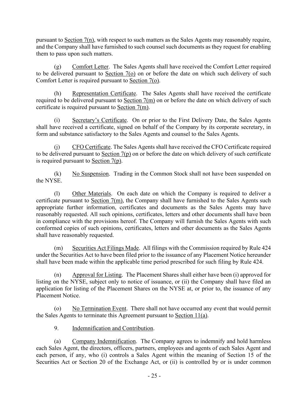 - 25 - pursuant to Section 7(n), with respect to such matters as the Sales Agents may reasonably require, and the Company shall have furnished to such counsel such documents as they request for enabling them to pass upon such matters. (g) Comfort Letter. The Sales Agents shall have received the Comfort Letter required to be delivered pursuant to Section 7(o) on or before the date on which such delivery of such Comfort Letter is required pursuant to Section 7(o). (h) Representation Certificate. The Sales Agents shall have received the certificate required to be delivered pursuant to Section 7(m) on or before the date on which delivery of such certificate is required pursuant to Section 7(m). (i) Secretary’s Certificate. On or prior to the First Delivery Date, the Sales Agents shall have received a certificate, signed on behalf of the Company by its corporate secretary, in form and substance satisfactory to the Sales Agents and counsel to the Sales Agents. (j) CFO Certificate. The Sales Agents shall have received the CFO Certificate required to be delivered pursuant to Section 7(p) on or before the date on which delivery of such certificate is required pursuant to Section 7(p). (k) No Suspension. Trading in the Common Stock shall not have been suspended on the NYSE. (l) Other Materials. On each date on which the Company is required to deliver a certificate pursuant to Section 7(m), the Company shall have furnished to the Sales Agents such appropriate further information, certificates and documents as the Sales Agents may have reasonably requested. All such opinions, certificates, letters and other documents shall have been in compliance with the provisions hereof. The Company will furnish the Sales Agents with such conformed copies of such opinions, certificates, letters and other documents as the Sales Agents shall have reasonably requested. (m) Securities Act Filings Made. All filings with the Commission required by Rule 424 under the Securities Act to have been filed prior to the issuance of any Placement Notice hereunder shall have been made within the applicable time period prescribed for such filing by Rule 424. (n) Approval for Listing. The Placement Shares shall either have been (i) approved for listing on the NYSE, subject only to notice of issuance, or (ii) the Company shall have filed an application for listing of the Placement Shares on the NYSE at, or prior to, the issuance of any Placement Notice. (o) No Termination Event. There shall not have occurred any event that would permit the Sales Agents to terminate this Agreement pursuant to Section 11(a). 9. Indemnification and Contribution. (a) Company Indemnification. The Company agrees to indemnify and hold harmless each Sales Agent, the directors, officers, partners, employees and agents of each Sales Agent and each person, if any, who (i) controls a Sales Agent within the meaning of Section 15 of the Securities Act or Section 20 of the Exchange Act, or (ii) is controlled by or is under common