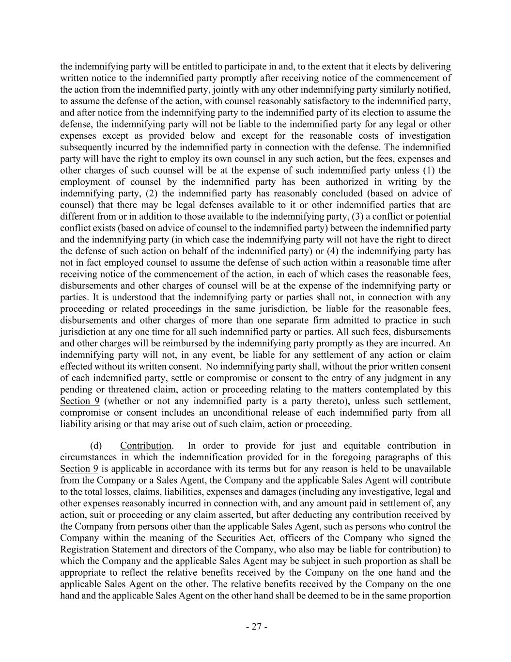 - 27 - the indemnifying party will be entitled to participate in and, to the extent that it elects by delivering written notice to the indemnified party promptly after receiving notice of the commencement of the action from the indemnified party, jointly with any other indemnifying party similarly notified, to assume the defense of the action, with counsel reasonably satisfactory to the indemnified party, and after notice from the indemnifying party to the indemnified party of its election to assume the defense, the indemnifying party will not be liable to the indemnified party for any legal or other expenses except as provided below and except for the reasonable costs of investigation subsequently incurred by the indemnified party in connection with the defense. The indemnified party will have the right to employ its own counsel in any such action, but the fees, expenses and other charges of such counsel will be at the expense of such indemnified party unless (1) the employment of counsel by the indemnified party has been authorized in writing by the indemnifying party, (2) the indemnified party has reasonably concluded (based on advice of counsel) that there may be legal defenses available to it or other indemnified parties that are different from or in addition to those available to the indemnifying party, (3) a conflict or potential conflict exists (based on advice of counsel to the indemnified party) between the indemnified party and the indemnifying party (in which case the indemnifying party will not have the right to direct the defense of such action on behalf of the indemnified party) or (4) the indemnifying party has not in fact employed counsel to assume the defense of such action within a reasonable time after receiving notice of the commencement of the action, in each of which cases the reasonable fees, disbursements and other charges of counsel will be at the expense of the indemnifying party or parties. It is understood that the indemnifying party or parties shall not, in connection with any proceeding or related proceedings in the same jurisdiction, be liable for the reasonable fees, disbursements and other charges of more than one separate firm admitted to practice in such jurisdiction at any one time for all such indemnified party or parties. All such fees, disbursements and other charges will be reimbursed by the indemnifying party promptly as they are incurred. An indemnifying party will not, in any event, be liable for any settlement of any action or claim effected without its written consent. No indemnifying party shall, without the prior written consent of each indemnified party, settle or compromise or consent to the entry of any judgment in any pending or threatened claim, action or proceeding relating to the matters contemplated by this Section 9 (whether or not any indemnified party is a party thereto), unless such settlement, compromise or consent includes an unconditional release of each indemnified party from all liability arising or that may arise out of such claim, action or proceeding. (d) Contribution. In order to provide for just and equitable contribution in circumstances in which the indemnification provided for in the foregoing paragraphs of this Section 9 is applicable in accordance with its terms but for any reason is held to be unavailable from the Company or a Sales Agent, the Company and the applicable Sales Agent will contribute to the total losses, claims, liabilities, expenses and damages (including any investigative, legal and other expenses reasonably incurred in connection with, and any amount paid in settlement of, any action, suit or proceeding or any claim asserted, but after deducting any contribution received by the Company from persons other than the applicable Sales Agent, such as persons who control the Company within the meaning of the Securities Act, officers of the Company who signed the Registration Statement and directors of the Company, who also may be liable for contribution) to which the Company and the applicable Sales Agent may be subject in such proportion as shall be appropriate to reflect the relative benefits received by the Company on the one hand and the applicable Sales Agent on the other. The relative benefits received by the Company on the one hand and the applicable Sales Agent on the other hand shall be deemed to be in the same proportion