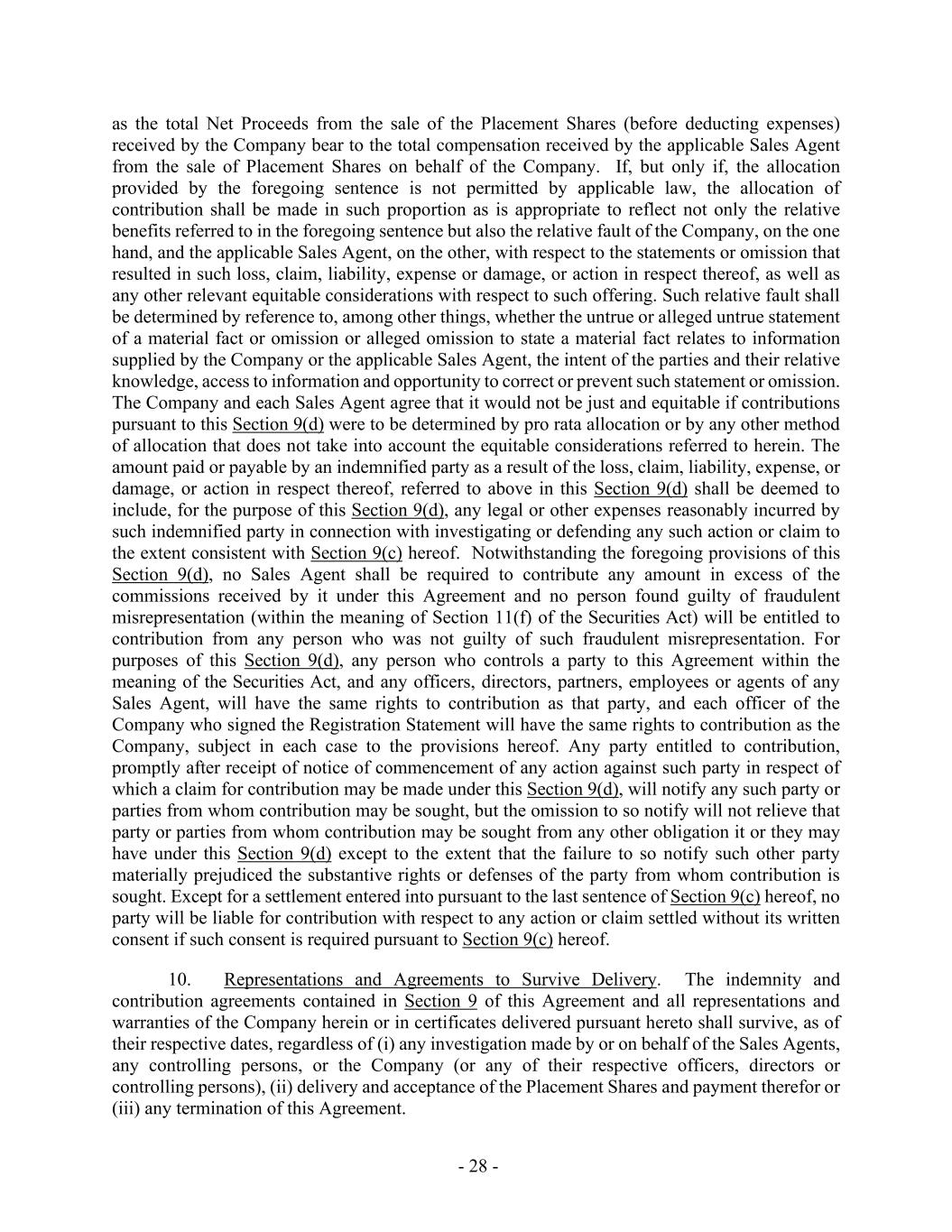 - 28 - as the total Net Proceeds from the sale of the Placement Shares (before deducting expenses) received by the Company bear to the total compensation received by the applicable Sales Agent from the sale of Placement Shares on behalf of the Company. If, but only if, the allocation provided by the foregoing sentence is not permitted by applicable law, the allocation of contribution shall be made in such proportion as is appropriate to reflect not only the relative benefits referred to in the foregoing sentence but also the relative fault of the Company, on the one hand, and the applicable Sales Agent, on the other, with respect to the statements or omission that resulted in such loss, claim, liability, expense or damage, or action in respect thereof, as well as any other relevant equitable considerations with respect to such offering. Such relative fault shall be determined by reference to, among other things, whether the untrue or alleged untrue statement of a material fact or omission or alleged omission to state a material fact relates to information supplied by the Company or the applicable Sales Agent, the intent of the parties and their relative knowledge, access to information and opportunity to correct or prevent such statement or omission. The Company and each Sales Agent agree that it would not be just and equitable if contributions pursuant to this Section 9(d) were to be determined by pro rata allocation or by any other method of allocation that does not take into account the equitable considerations referred to herein. The amount paid or payable by an indemnified party as a result of the loss, claim, liability, expense, or damage, or action in respect thereof, referred to above in this Section 9(d) shall be deemed to include, for the purpose of this Section 9(d), any legal or other expenses reasonably incurred by such indemnified party in connection with investigating or defending any such action or claim to the extent consistent with Section 9(c) hereof. Notwithstanding the foregoing provisions of this Section 9(d), no Sales Agent shall be required to contribute any amount in excess of the commissions received by it under this Agreement and no person found guilty of fraudulent misrepresentation (within the meaning of Section 11(f) of the Securities Act) will be entitled to contribution from any person who was not guilty of such fraudulent misrepresentation. For purposes of this Section 9(d), any person who controls a party to this Agreement within the meaning of the Securities Act, and any officers, directors, partners, employees or agents of any Sales Agent, will have the same rights to contribution as that party, and each officer of the Company who signed the Registration Statement will have the same rights to contribution as the Company, subject in each case to the provisions hereof. Any party entitled to contribution, promptly after receipt of notice of commencement of any action against such party in respect of which a claim for contribution may be made under this Section 9(d), will notify any such party or parties from whom contribution may be sought, but the omission to so notify will not relieve that party or parties from whom contribution may be sought from any other obligation it or they may have under this Section 9(d) except to the extent that the failure to so notify such other party materially prejudiced the substantive rights or defenses of the party from whom contribution is sought. Except for a settlement entered into pursuant to the last sentence of Section 9(c) hereof, no party will be liable for contribution with respect to any action or claim settled without its written consent if such consent is required pursuant to Section 9(c) hereof. 10. Representations and Agreements to Survive Delivery. The indemnity and contribution agreements contained in Section 9 of this Agreement and all representations and warranties of the Company herein or in certificates delivered pursuant hereto shall survive, as of their respective dates, regardless of (i) any investigation made by or on behalf of the Sales Agents, any controlling persons, or the Company (or any of their respective officers, directors or controlling persons), (ii) delivery and acceptance of the Placement Shares and payment therefor or (iii) any termination of this Agreement.