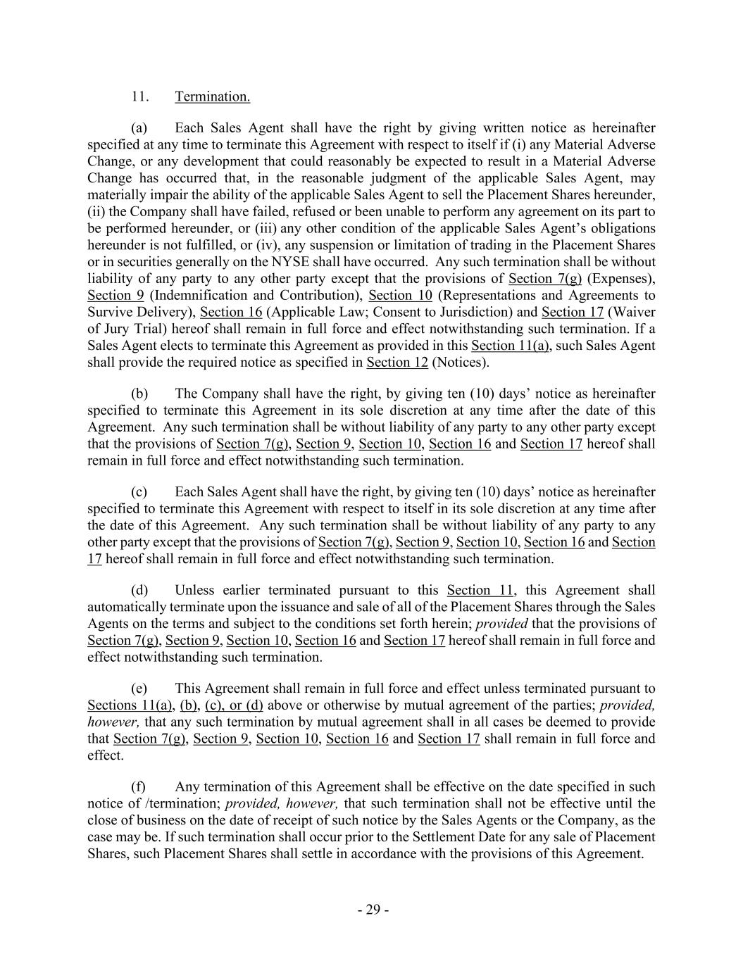 - 29 - 11. Termination. (a) Each Sales Agent shall have the right by giving written notice as hereinafter specified at any time to terminate this Agreement with respect to itself if (i) any Material Adverse Change, or any development that could reasonably be expected to result in a Material Adverse Change has occurred that, in the reasonable judgment of the applicable Sales Agent, may materially impair the ability of the applicable Sales Agent to sell the Placement Shares hereunder, (ii) the Company shall have failed, refused or been unable to perform any agreement on its part to be performed hereunder, or (iii) any other condition of the applicable Sales Agent’s obligations hereunder is not fulfilled, or (iv), any suspension or limitation of trading in the Placement Shares or in securities generally on the NYSE shall have occurred. Any such termination shall be without liability of any party to any other party except that the provisions of Section 7(g) (Expenses), Section 9 (Indemnification and Contribution), Section 10 (Representations and Agreements to Survive Delivery), Section 16 (Applicable Law; Consent to Jurisdiction) and Section 17 (Waiver of Jury Trial) hereof shall remain in full force and effect notwithstanding such termination. If a Sales Agent elects to terminate this Agreement as provided in this Section 11(a), such Sales Agent shall provide the required notice as specified in Section 12 (Notices). (b) The Company shall have the right, by giving ten (10) days’ notice as hereinafter specified to terminate this Agreement in its sole discretion at any time after the date of this Agreement. Any such termination shall be without liability of any party to any other party except that the provisions of Section 7(g), Section 9, Section 10, Section 16 and Section 17 hereof shall remain in full force and effect notwithstanding such termination. (c) Each Sales Agent shall have the right, by giving ten (10) days’ notice as hereinafter specified to terminate this Agreement with respect to itself in its sole discretion at any time after the date of this Agreement. Any such termination shall be without liability of any party to any other party except that the provisions of Section 7(g), Section 9, Section 10, Section 16 and Section 17 hereof shall remain in full force and effect notwithstanding such termination. (d) Unless earlier terminated pursuant to this Section 11, this Agreement shall automatically terminate upon the issuance and sale of all of the Placement Shares through the Sales Agents on the terms and subject to the conditions set forth herein; provided that the provisions of Section 7(g), Section 9, Section 10, Section 16 and Section 17 hereof shall remain in full force and effect notwithstanding such termination. (e) This Agreement shall remain in full force and effect unless terminated pursuant to Sections 11(a), (b), (c), or (d) above or otherwise by mutual agreement of the parties; provided, however, that any such termination by mutual agreement shall in all cases be deemed to provide that Section 7(g), Section 9, Section 10, Section 16 and Section 17 shall remain in full force and effect. (f) Any termination of this Agreement shall be effective on the date specified in such notice of /termination; provided, however, that such termination shall not be effective until the close of business on the date of receipt of such notice by the Sales Agents or the Company, as the case may be. If such termination shall occur prior to the Settlement Date for any sale of Placement Shares, such Placement Shares shall settle in accordance with the provisions of this Agreement.