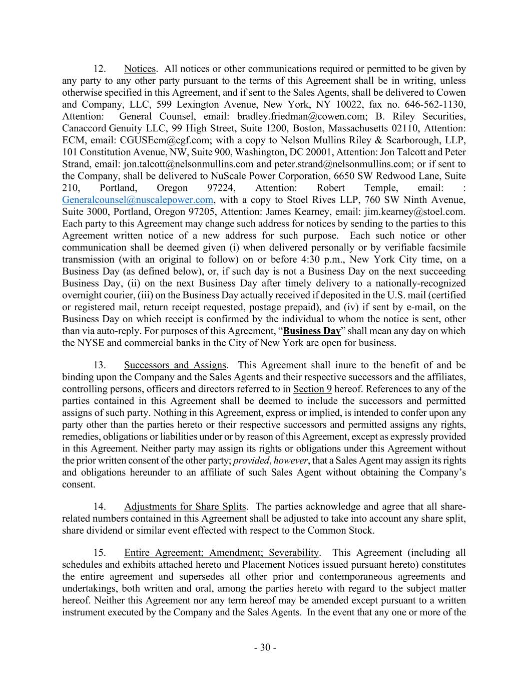 - 30 - 12. Notices. All notices or other communications required or permitted to be given by any party to any other party pursuant to the terms of this Agreement shall be in writing, unless otherwise specified in this Agreement, and if sent to the Sales Agents, shall be delivered to Cowen and Company, LLC, 599 Lexington Avenue, New York, NY 10022, fax no. 646-562-1130, Attention: General Counsel, email: bradley.friedman@cowen.com; B. Riley Securities, Canaccord Genuity LLC, 99 High Street, Suite 1200, Boston, Massachusetts 02110, Attention: ECM, email: CGUSEcm@cgf.com; with a copy to Nelson Mullins Riley & Scarborough, LLP, 101 Constitution Avenue, NW, Suite 900, Washington, DC 20001, Attention: Jon Talcott and Peter Strand, email: jon.talcott@nelsonmullins.com and peter.strand@nelsonmullins.com; or if sent to the Company, shall be delivered to NuScale Power Corporation, 6650 SW Redwood Lane, Suite 210, Portland, Oregon 97224, Attention: Robert Temple, email: : Generalcounsel@nuscalepower.com, with a copy to Stoel Rives LLP, 760 SW Ninth Avenue, Suite 3000, Portland, Oregon 97205, Attention: James Kearney, email: jim.kearney@stoel.com. Each party to this Agreement may change such address for notices by sending to the parties to this Agreement written notice of a new address for such purpose. Each such notice or other communication shall be deemed given (i) when delivered personally or by verifiable facsimile transmission (with an original to follow) on or before 4:30 p.m., New York City time, on a Business Day (as defined below), or, if such day is not a Business Day on the next succeeding Business Day, (ii) on the next Business Day after timely delivery to a nationally-recognized overnight courier, (iii) on the Business Day actually received if deposited in the U.S. mail (certified or registered mail, return receipt requested, postage prepaid), and (iv) if sent by e-mail, on the Business Day on which receipt is confirmed by the individual to whom the notice is sent, other than via auto-reply. For purposes of this Agreement, “Business Day” shall mean any day on which the NYSE and commercial banks in the City of New York are open for business. 13. Successors and Assigns. This Agreement shall inure to the benefit of and be binding upon the Company and the Sales Agents and their respective successors and the affiliates, controlling persons, officers and directors referred to in Section 9 hereof. References to any of the parties contained in this Agreement shall be deemed to include the successors and permitted assigns of such party. Nothing in this Agreement, express or implied, is intended to confer upon any party other than the parties hereto or their respective successors and permitted assigns any rights, remedies, obligations or liabilities under or by reason of this Agreement, except as expressly provided in this Agreement. Neither party may assign its rights or obligations under this Agreement without the prior written consent of the other party; provided, however, that a Sales Agent may assign its rights and obligations hereunder to an affiliate of such Sales Agent without obtaining the Company’s consent. 14. Adjustments for Share Splits. The parties acknowledge and agree that all share- related numbers contained in this Agreement shall be adjusted to take into account any share split, share dividend or similar event effected with respect to the Common Stock. 15. Entire Agreement; Amendment; Severability. This Agreement (including all schedules and exhibits attached hereto and Placement Notices issued pursuant hereto) constitutes the entire agreement and supersedes all other prior and contemporaneous agreements and undertakings, both written and oral, among the parties hereto with regard to the subject matter hereof. Neither this Agreement nor any term hereof may be amended except pursuant to a written instrument executed by the Company and the Sales Agents. In the event that any one or more of the