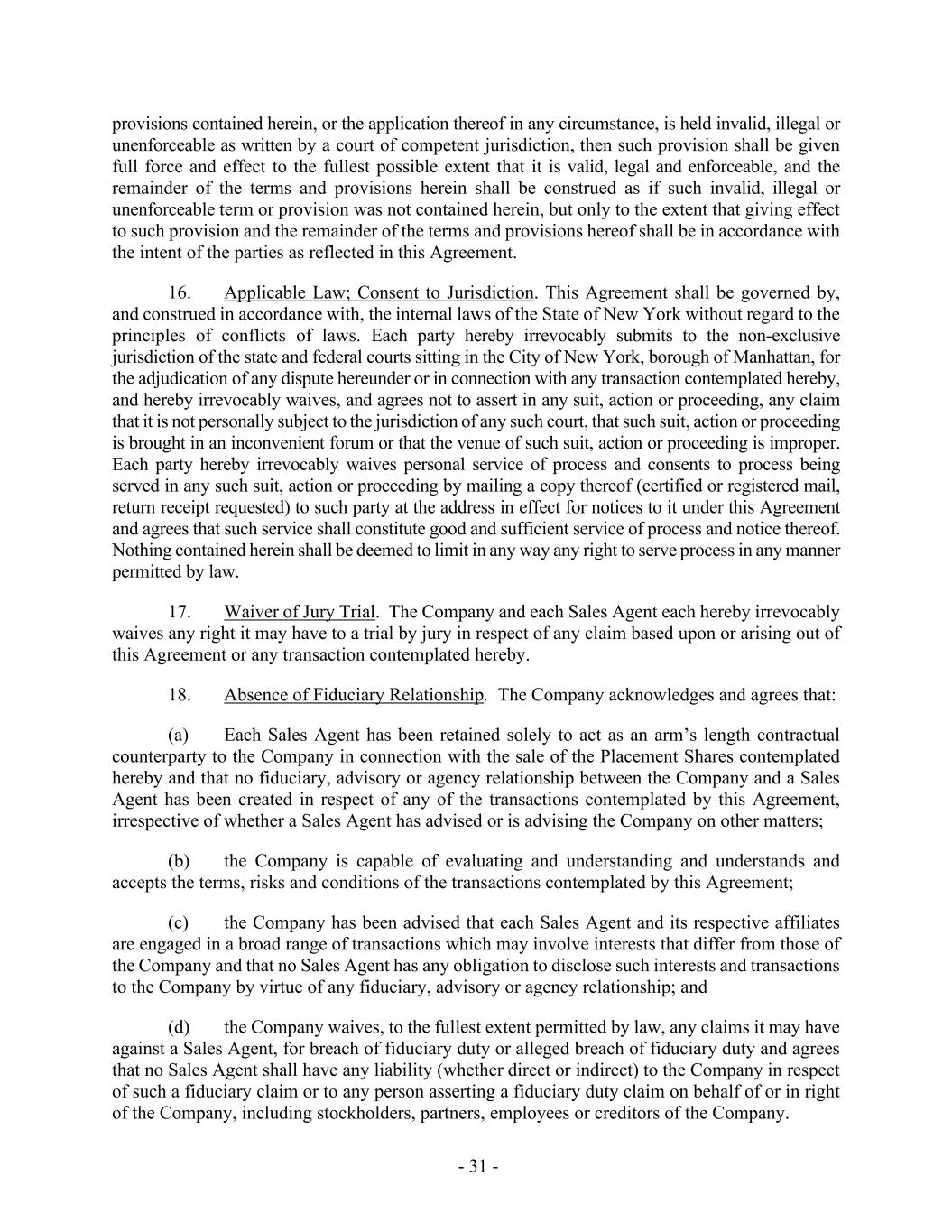 - 31 - provisions contained herein, or the application thereof in any circumstance, is held invalid, illegal or unenforceable as written by a court of competent jurisdiction, then such provision shall be given full force and effect to the fullest possible extent that it is valid, legal and enforceable, and the remainder of the terms and provisions herein shall be construed as if such invalid, illegal or unenforceable term or provision was not contained herein, but only to the extent that giving effect to such provision and the remainder of the terms and provisions hereof shall be in accordance with the intent of the parties as reflected in this Agreement. 16. Applicable Law; Consent to Jurisdiction. This Agreement shall be governed by, and construed in accordance with, the internal laws of the State of New York without regard to the principles of conflicts of laws. Each party hereby irrevocably submits to the non-exclusive jurisdiction of the state and federal courts sitting in the City of New York, borough of Manhattan, for the adjudication of any dispute hereunder or in connection with any transaction contemplated hereby, and hereby irrevocably waives, and agrees not to assert in any suit, action or proceeding, any claim that it is not personally subject to the jurisdiction of any such court, that such suit, action or proceeding is brought in an inconvenient forum or that the venue of such suit, action or proceeding is improper. Each party hereby irrevocably waives personal service of process and consents to process being served in any such suit, action or proceeding by mailing a copy thereof (certified or registered mail, return receipt requested) to such party at the address in effect for notices to it under this Agreement and agrees that such service shall constitute good and sufficient service of process and notice thereof. Nothing contained herein shall be deemed to limit in any way any right to serve process in any manner permitted by law. 17. Waiver of Jury Trial. The Company and each Sales Agent each hereby irrevocably waives any right it may have to a trial by jury in respect of any claim based upon or arising out of this Agreement or any transaction contemplated hereby. 18. Absence of Fiduciary Relationship. The Company acknowledges and agrees that: (a) Each Sales Agent has been retained solely to act as an arm’s length contractual counterparty to the Company in connection with the sale of the Placement Shares contemplated hereby and that no fiduciary, advisory or agency relationship between the Company and a Sales Agent has been created in respect of any of the transactions contemplated by this Agreement, irrespective of whether a Sales Agent has advised or is advising the Company on other matters; (b) the Company is capable of evaluating and understanding and understands and accepts the terms, risks and conditions of the transactions contemplated by this Agreement; (c) the Company has been advised that each Sales Agent and its respective affiliates are engaged in a broad range of transactions which may involve interests that differ from those of the Company and that no Sales Agent has any obligation to disclose such interests and transactions to the Company by virtue of any fiduciary, advisory or agency relationship; and (d) the Company waives, to the fullest extent permitted by law, any claims it may have against a Sales Agent, for breach of fiduciary duty or alleged breach of fiduciary duty and agrees that no Sales Agent shall have any liability (whether direct or indirect) to the Company in respect of such a fiduciary claim or to any person asserting a fiduciary duty claim on behalf of or in right of the Company, including stockholders, partners, employees or creditors of the Company.