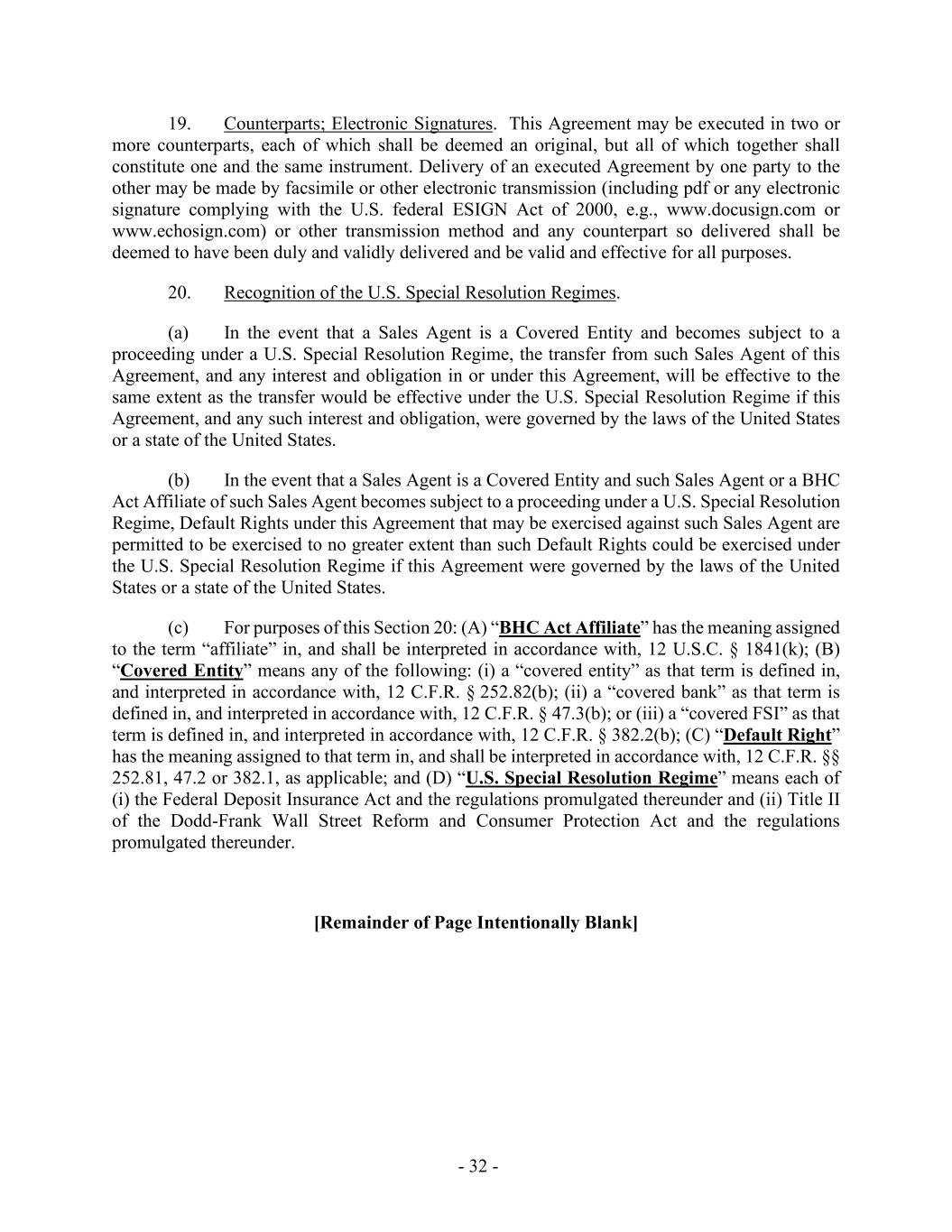 - 32 - 19. Counterparts; Electronic Signatures. This Agreement may be executed in two or more counterparts, each of which shall be deemed an original, but all of which together shall constitute one and the same instrument. Delivery of an executed Agreement by one party to the other may be made by facsimile or other electronic transmission (including pdf or any electronic signature complying with the U.S. federal ESIGN Act of 2000, e.g., www.docusign.com or www.echosign.com) or other transmission method and any counterpart so delivered shall be deemed to have been duly and validly delivered and be valid and effective for all purposes. 20. Recognition of the U.S. Special Resolution Regimes. (a) In the event that a Sales Agent is a Covered Entity and becomes subject to a proceeding under a U.S. Special Resolution Regime, the transfer from such Sales Agent of this Agreement, and any interest and obligation in or under this Agreement, will be effective to the same extent as the transfer would be effective under the U.S. Special Resolution Regime if this Agreement, and any such interest and obligation, were governed by the laws of the United States or a state of the United States. (b) In the event that a Sales Agent is a Covered Entity and such Sales Agent or a BHC Act Affiliate of such Sales Agent becomes subject to a proceeding under a U.S. Special Resolution Regime, Default Rights under this Agreement that may be exercised against such Sales Agent are permitted to be exercised to no greater extent than such Default Rights could be exercised under the U.S. Special Resolution Regime if this Agreement were governed by the laws of the United States or a state of the United States. (c) For purposes of this Section 20: (A) “BHC Act Affiliate” has the meaning assigned to the term “affiliate” in, and shall be interpreted in accordance with, 12 U.S.C. § 1841(k); (B) “Covered Entity” means any of the following: (i) a “covered entity” as that term is defined in, and interpreted in accordance with, 12 C.F.R. § 252.82(b); (ii) a “covered bank” as that term is defined in, and interpreted in accordance with, 12 C.F.R. § 47.3(b); or (iii) a “covered FSI” as that term is defined in, and interpreted in accordance with, 12 C.F.R. § 382.2(b); (C) “Default Right” has the meaning assigned to that term in, and shall be interpreted in accordance with, 12 C.F.R. §§ 252.81, 47.2 or 382.1, as applicable; and (D) “U.S. Special Resolution Regime” means each of (i) the Federal Deposit Insurance Act and the regulations promulgated thereunder and (ii) Title II of the Dodd-Frank Wall Street Reform and Consumer Protection Act and the regulations promulgated thereunder. [Remainder of Page Intentionally Blank]
