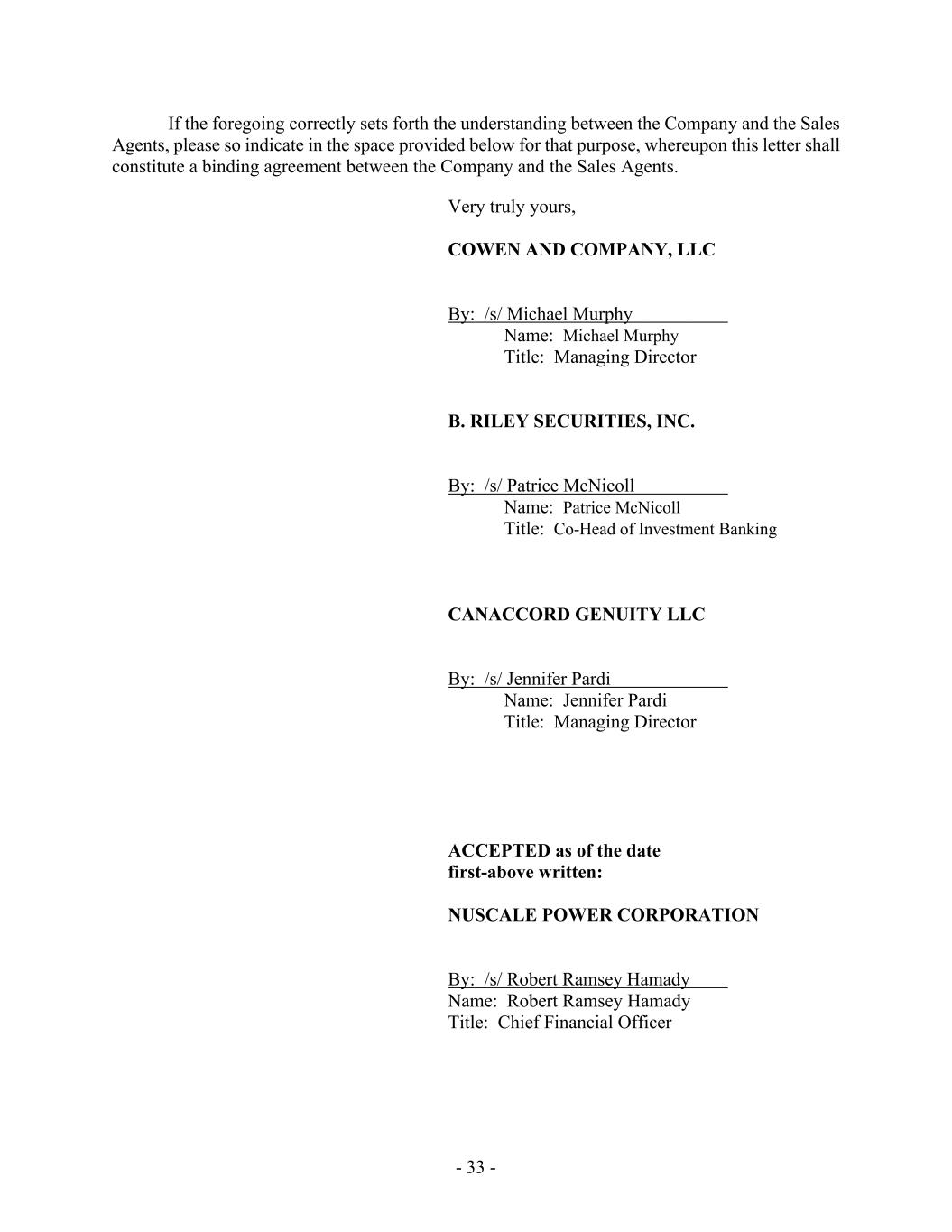 - 33 - If the foregoing correctly sets forth the understanding between the Company and the Sales Agents, please so indicate in the space provided below for that purpose, whereupon this letter shall constitute a binding agreement between the Company and the Sales Agents. Very truly yours, COWEN AND COMPANY, LLC By: /s/ Michael Murphy Name: Michael Murphy Title: Managing Director B. RILEY SECURITIES, INC. By: /s/ Patrice McNicoll Name: Patrice McNicoll Title: Co-Head of Investment Banking CANACCORD GENUITY LLC By: /s/ Jennifer Pardi Name: Jennifer Pardi Title: Managing Director ACCEPTED as of the date first-above written: NUSCALE POWER CORPORATION By: /s/ Robert Ramsey Hamady Name: Robert Ramsey Hamady Title: Chief Financial Officer
