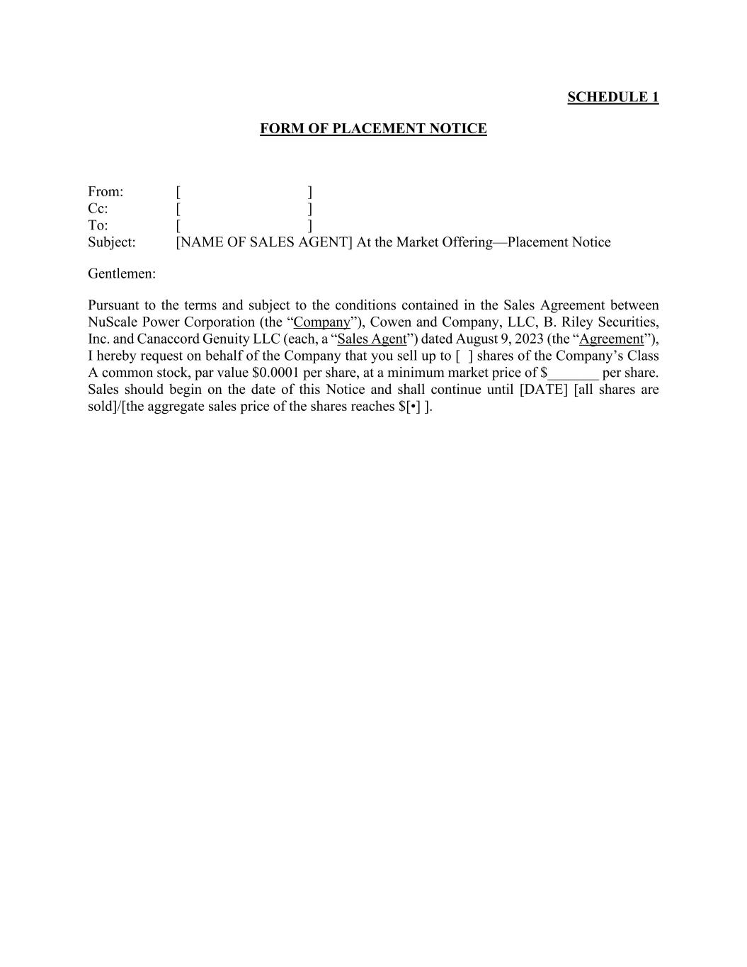 SCHEDULE 1 FORM OF PLACEMENT NOTICE From: [ ] Cc: [ ] To: [ ] Subject: [NAME OF SALES AGENT] At the Market Offering—Placement Notice Gentlemen: Pursuant to the terms and subject to the conditions contained in the Sales Agreement between NuScale Power Corporation (the “Company”), Cowen and Company, LLC, B. Riley Securities, Inc. and Canaccord Genuity LLC (each, a “Sales Agent”) dated August 9, 2023 (the “Agreement”), I hereby request on behalf of the Company that you sell up to [ ] shares of the Company’s Class A common stock, par value $0.0001 per share, at a minimum market price of $_______ per share. Sales should begin on the date of this Notice and shall continue until [DATE] [all shares are sold]/[the aggregate sales price of the shares reaches $[•] ].