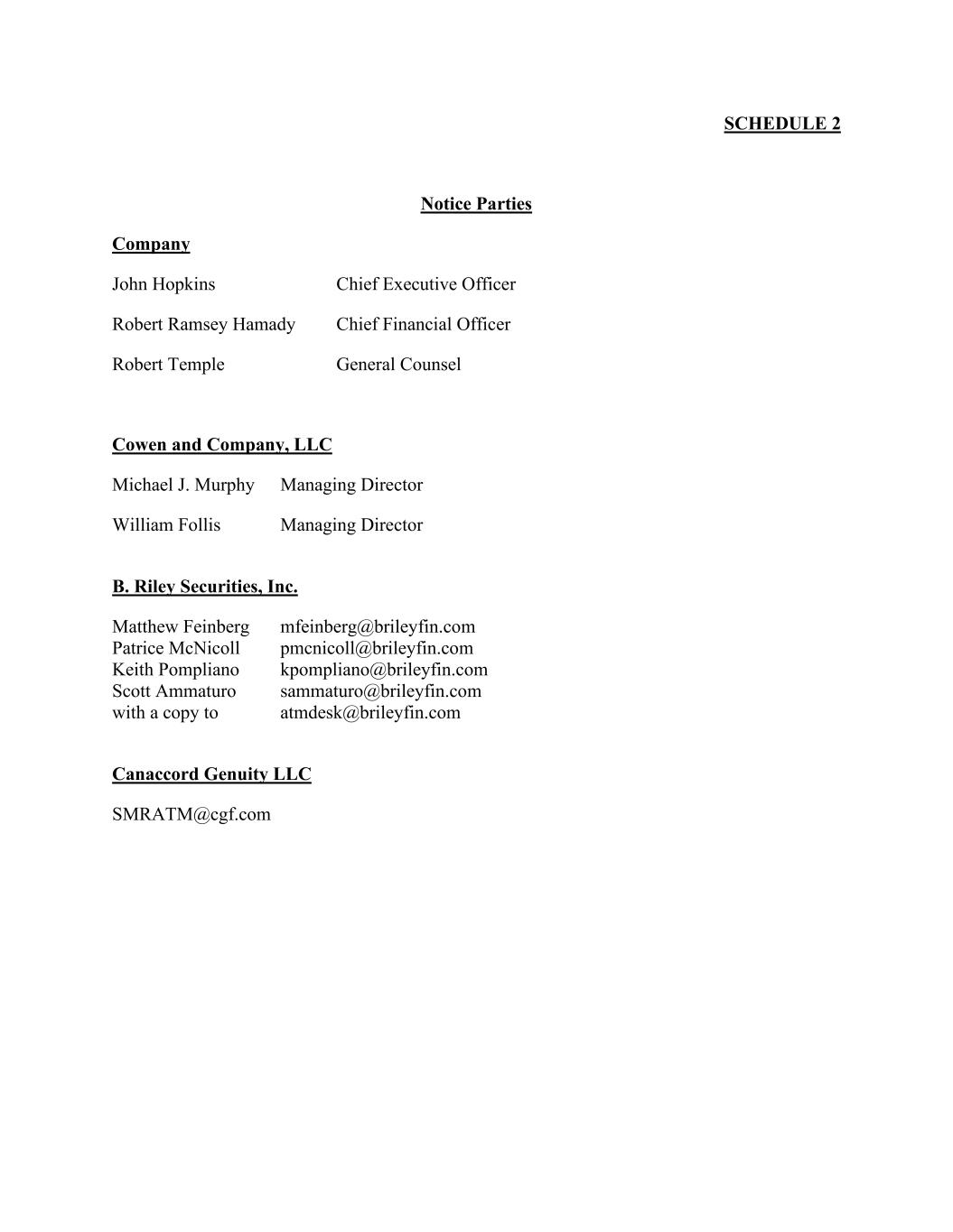 SCHEDULE 2 Notice Parties Company John Hopkins Chief Executive Officer Robert Ramsey Hamady Chief Financial Officer Robert Temple General Counsel Cowen and Company, LLC Michael J. Murphy Managing Director William Follis Managing Director B. Riley Securities, Inc. Matthew Feinberg mfeinberg@brileyfin.com Patrice McNicoll pmcnicoll@brileyfin.com Keith Pompliano kpompliano@brileyfin.com Scott Ammaturo sammaturo@brileyfin.com with a copy to atmdesk@brileyfin.com Canaccord Genuity LLC SMRATM@cgf.com