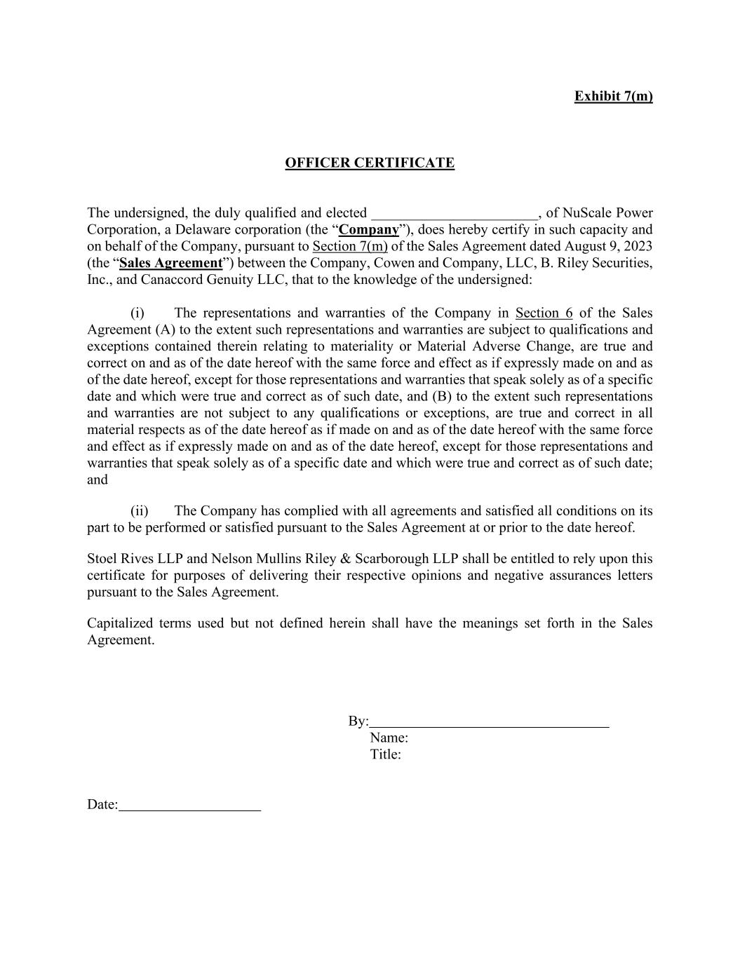 Exhibit 7(m) OFFICER CERTIFICATE The undersigned, the duly qualified and elected _______________________, of NuScale Power Corporation, a Delaware corporation (the “Company”), does hereby certify in such capacity and on behalf of the Company, pursuant to Section 7(m) of the Sales Agreement dated August 9, 2023 (the “Sales Agreement”) between the Company, Cowen and Company, LLC, B. Riley Securities, Inc., and Canaccord Genuity LLC, that to the knowledge of the undersigned: (i) The representations and warranties of the Company in Section 6 of the Sales Agreement (A) to the extent such representations and warranties are subject to qualifications and exceptions contained therein relating to materiality or Material Adverse Change, are true and correct on and as of the date hereof with the same force and effect as if expressly made on and as of the date hereof, except for those representations and warranties that speak solely as of a specific date and which were true and correct as of such date, and (B) to the extent such representations and warranties are not subject to any qualifications or exceptions, are true and correct in all material respects as of the date hereof as if made on and as of the date hereof with the same force and effect as if expressly made on and as of the date hereof, except for those representations and warranties that speak solely as of a specific date and which were true and correct as of such date; and (ii) The Company has complied with all agreements and satisfied all conditions on its part to be performed or satisfied pursuant to the Sales Agreement at or prior to the date hereof. Stoel Rives LLP and Nelson Mullins Riley & Scarborough LLP shall be entitled to rely upon this certificate for purposes of delivering their respective opinions and negative assurances letters pursuant to the Sales Agreement. Capitalized terms used but not defined herein shall have the meanings set forth in the Sales Agreement. By: Name: Title: Date: