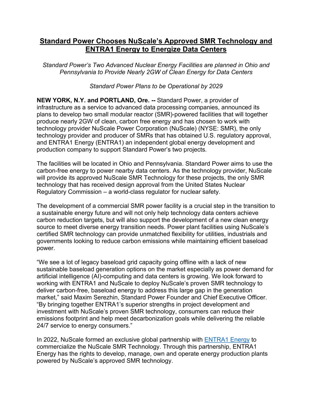 Standard Power Chooses NuScale’s Approved SMR Technology and ENTRA1 Energy to Energize Data Centers Standard Power’s Two Advanced Nuclear Energy Facilities are planned in Ohio and Pennsylvania to Provide Nearly 2GW of Clean Energy for Data Centers Standard Power Plans to be Operational by 2029 NEW YORK, N.Y. and PORTLAND, Ore. -- Standard Power, a provider of infrastructure as a service to advanced data processing companies, announced its plans to develop two small modular reactor (SMR)-powered facilities that will together produce nearly 2GW of clean, carbon free energy and has chosen to work with technology provider NuScale Power Corporation (NuScale) (NYSE: SMR), the only technology provider and producer of SMRs that has obtained U.S. regulatory approval, and ENTRA1 Energy (ENTRA1) an independent global energy development and production company to support Standard Power’s two projects. The facilities will be located in Ohio and Pennsylvania. Standard Power aims to use the carbon-free energy to power nearby data centers. As the technology provider, NuScale will provide its approved NuScale SMR Technology for these projects, the only SMR technology that has received design approval from the United States Nuclear Regulatory Commission – a world-class regulator for nuclear safety. The development of a commercial SMR power facility is a crucial step in the transition to a sustainable energy future and will not only help technology data centers achieve carbon reduction targets, but will also support the development of a new clean energy source to meet diverse energy transition needs. Power plant facilities using NuScale’s certified SMR technology can provide unmatched flexibility for utilities, industrials and governments looking to reduce carbon emissions while maintaining efficient baseload power. “We see a lot of legacy baseload grid capacity going offline with a lack of new sustainable baseload generation options on the market especially as power demand for artificial intelligence (AI)-computing and data centers is growing. We look forward to working with ENTRA1 and NuScale to deploy NuScale’s proven SMR technology to deliver carbon-free, baseload energy to address this large gap in the generation market,” said Maxim Serezhin, Standard Power Founder and Chief Executive Officer. “By bringing together ENTRA1’s superior strengths in project development and investment with NuScale’s proven SMR technology, consumers can reduce their emissions footprint and help meet decarbonization goals while delivering the reliable 24/7 service to energy consumers.” In 2022, NuScale formed an exclusive global partnership with ENTRA1 Energy to commercialize the NuScale SMR Technology. Through this partnership, ENTRA1 Energy has the rights to develop, manage, own and operate energy production plants powered by NuScale’s approved SMR technology.