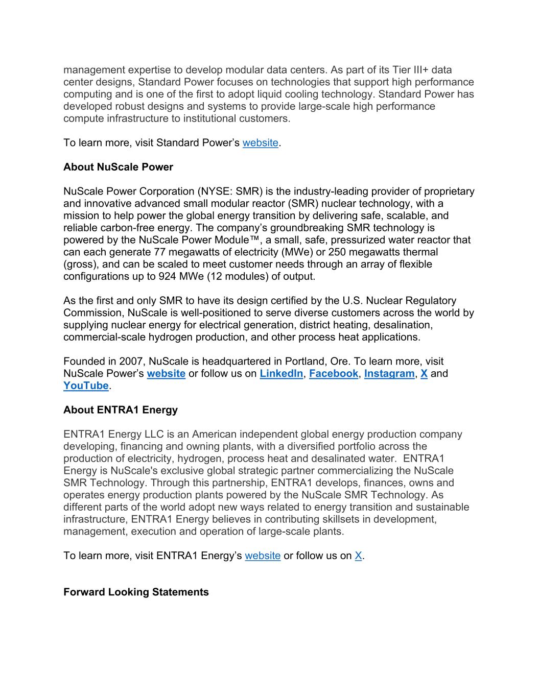 management expertise to develop modular data centers. As part of its Tier III+ data center designs, Standard Power focuses on technologies that support high performance computing and is one of the first to adopt liquid cooling technology. Standard Power has developed robust designs and systems to provide large-scale high performance compute infrastructure to institutional customers. To learn more, visit Standard Power’s website. About NuScale Power NuScale Power Corporation (NYSE: SMR) is the industry-leading provider of proprietary and innovative advanced small modular reactor (SMR) nuclear technology, with a mission to help power the global energy transition by delivering safe, scalable, and reliable carbon-free energy. The company’s groundbreaking SMR technology is powered by the NuScale Power Module™, a small, safe, pressurized water reactor that can each generate 77 megawatts of electricity (MWe) or 250 megawatts thermal (gross), and can be scaled to meet customer needs through an array of flexible configurations up to 924 MWe (12 modules) of output. As the first and only SMR to have its design certified by the U.S. Nuclear Regulatory Commission, NuScale is well-positioned to serve diverse customers across the world by supplying nuclear energy for electrical generation, district heating, desalination, commercial-scale hydrogen production, and other process heat applications. Founded in 2007, NuScale is headquartered in Portland, Ore. To learn more, visit NuScale Power’s website or follow us on LinkedIn, Facebook, Instagram, X and YouTube. About ENTRA1 Energy ENTRA1 Energy LLC is an American independent global energy production company developing, financing and owning plants, with a diversified portfolio across the production of electricity, hydrogen, process heat and desalinated water. ENTRA1 Energy is NuScale's exclusive global strategic partner commercializing the NuScale SMR Technology. Through this partnership, ENTRA1 develops, finances, owns and operates energy production plants powered by the NuScale SMR Technology. As different parts of the world adopt new ways related to energy transition and sustainable infrastructure, ENTRA1 Energy believes in contributing skillsets in development, management, execution and operation of large-scale plants. To learn more, visit ENTRA1 Energy’s website or follow us on X. Forward Looking Statements