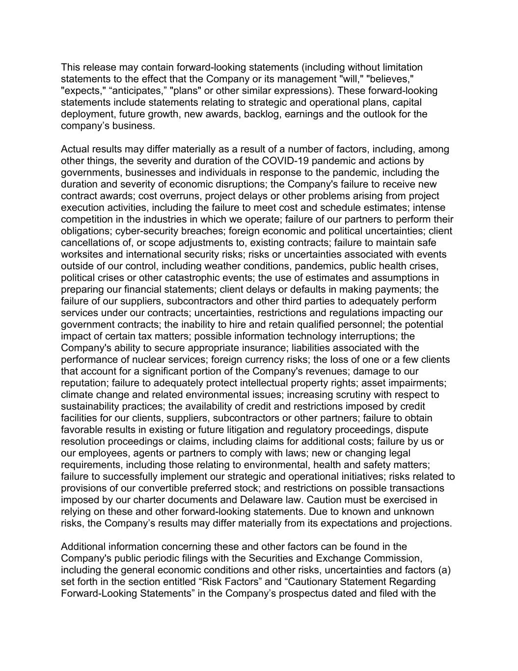 This release may contain forward-looking statements (including without limitation statements to the effect that the Company or its management "will," "believes," "expects," “anticipates,” "plans" or other similar expressions). These forward-looking statements include statements relating to strategic and operational plans, capital deployment, future growth, new awards, backlog, earnings and the outlook for the company’s business. Actual results may differ materially as a result of a number of factors, including, among other things, the severity and duration of the COVID-19 pandemic and actions by governments, businesses and individuals in response to the pandemic, including the duration and severity of economic disruptions; the Company's failure to receive new contract awards; cost overruns, project delays or other problems arising from project execution activities, including the failure to meet cost and schedule estimates; intense competition in the industries in which we operate; failure of our partners to perform their obligations; cyber-security breaches; foreign economic and political uncertainties; client cancellations of, or scope adjustments to, existing contracts; failure to maintain safe worksites and international security risks; risks or uncertainties associated with events outside of our control, including weather conditions, pandemics, public health crises, political crises or other catastrophic events; the use of estimates and assumptions in preparing our financial statements; client delays or defaults in making payments; the failure of our suppliers, subcontractors and other third parties to adequately perform services under our contracts; uncertainties, restrictions and regulations impacting our government contracts; the inability to hire and retain qualified personnel; the potential impact of certain tax matters; possible information technology interruptions; the Company's ability to secure appropriate insurance; liabilities associated with the performance of nuclear services; foreign currency risks; the loss of one or a few clients that account for a significant portion of the Company's revenues; damage to our reputation; failure to adequately protect intellectual property rights; asset impairments; climate change and related environmental issues; increasing scrutiny with respect to sustainability practices; the availability of credit and restrictions imposed by credit facilities for our clients, suppliers, subcontractors or other partners; failure to obtain favorable results in existing or future litigation and regulatory proceedings, dispute resolution proceedings or claims, including claims for additional costs; failure by us or our employees, agents or partners to comply with laws; new or changing legal requirements, including those relating to environmental, health and safety matters; failure to successfully implement our strategic and operational initiatives; risks related to provisions of our convertible preferred stock; and restrictions on possible transactions imposed by our charter documents and Delaware law. Caution must be exercised in relying on these and other forward-looking statements. Due to known and unknown risks, the Company’s results may differ materially from its expectations and projections. Additional information concerning these and other factors can be found in the Company's public periodic filings with the Securities and Exchange Commission, including the general economic conditions and other risks, uncertainties and factors (a) set forth in the section entitled “Risk Factors” and “Cautionary Statement Regarding Forward-Looking Statements” in the Company’s prospectus dated and filed with the