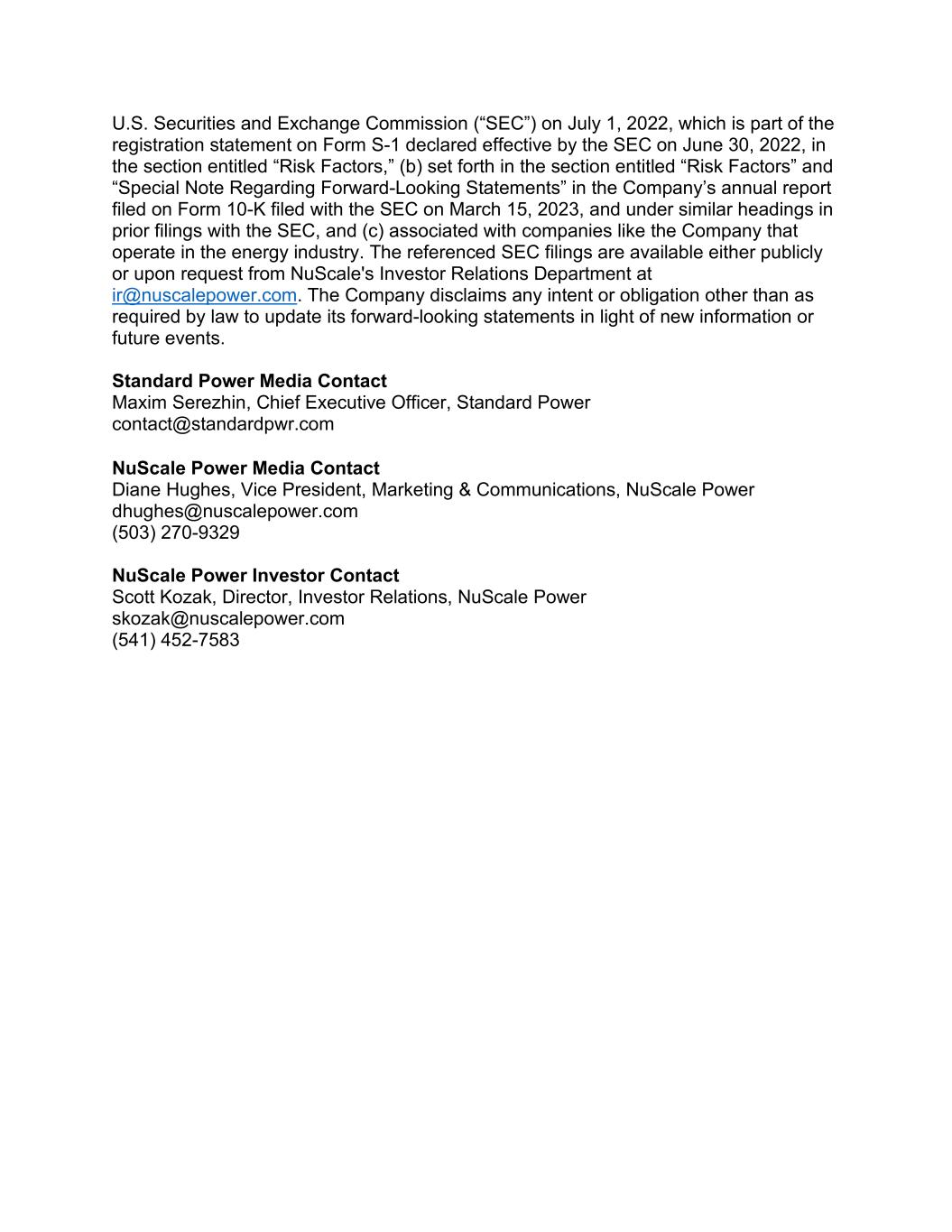 U.S. Securities and Exchange Commission (“SEC”) on July 1, 2022, which is part of the registration statement on Form S-1 declared effective by the SEC on June 30, 2022, in the section entitled “Risk Factors,” (b) set forth in the section entitled “Risk Factors” and “Special Note Regarding Forward-Looking Statements” in the Company’s annual report filed on Form 10-K filed with the SEC on March 15, 2023, and under similar headings in prior filings with the SEC, and (c) associated with companies like the Company that operate in the energy industry. The referenced SEC filings are available either publicly or upon request from NuScale's Investor Relations Department at ir@nuscalepower.com. The Company disclaims any intent or obligation other than as required by law to update its forward-looking statements in light of new information or future events. Standard Power Media Contact Maxim Serezhin, Chief Executive Officer, Standard Power contact@standardpwr.com NuScale Power Media Contact Diane Hughes, Vice President, Marketing & Communications, NuScale Power dhughes@nuscalepower.com (503) 270-9329 NuScale Power Investor Contact Scott Kozak, Director, Investor Relations, NuScale Power skozak@nuscalepower.com (541) 452-7583