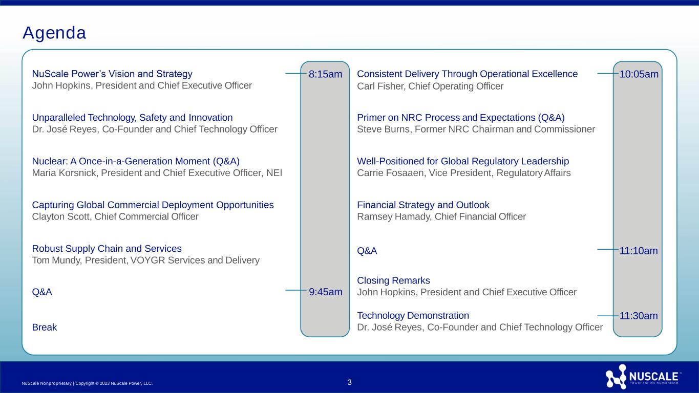 2NuScale Nonproprietary | Copyright © 2023 NuScale Power, LLC. Forward-Looking Statements This presentation (“Presentation”) and any oral statements made in connection with the Presentation do not constitute an offer to sell or a solicitation of an offer to buy any securities. Certain statements in this Presentation may constitute “forward-looking statements” within the meaning of the U.S. Private Securities Litigation Reform Act of 1995. Forward-looking statements include statements regarding the expectations, hopes, beliefs, intentions or strategies of NuScale Power Corporation (the “Company”) regarding the future, including, without limitation, statements regarding plans for research and development programs and expectations regarding revenues and profitability. In addition, any statements regarding projections, forecasts, or other characterizations of future events or circumstances, including any underlying assumptions, are forward-looking statements. Words such as “anticipate,” “believe,” “continue,” “could,” “estimate,” “expect,” “intend,” “may,” “might,” “plan,” “possible,” “potential,” “predict,” “project,” “should,” “strive,” “would” and similar expressions may identify forward-looking statements, but the absence of these words does not mean that statement is not forward looking. Forward-looking statements are based on current expectations and assumptions that, while considered reasonable by the Company and its management, are inherently uncertain. New risks and uncertainties may emerge from time to time, and it is not possible to predict all risks and uncertainties. Factors that may cause actual results to differ materially from current expectations include, but are not limited to, general economic conditions and other risks, uncertainties and factors (a) set forth in the section entitled “Cautionary Statement Regarding Forward-Looking Statements and Risk Factors”” in the Company’s annual report on Form 10-K for the period ended December 3, 2022, the Form S-1 filed on March 20, 2023 and declared effective on March 23, 2023, the Registration Statement on Form S-3 filed on June 1, 2023 and declared effective on June 5, 2023, and under similar headings in subsequent filings with the SEC, and (b) associated with companies like the Company that operate in the energy industry. Such differences may result both from actions within the control of the Company, such as capital investments, asset acquisitions, and marketing initiatives, and from actions outside the control of the Company, such as the demand for the Company’s products, changes in technology, competition and general economic and market conditions. Nothing in this Presentation should be regarded as a representation that any forward-looking statement set forth herein, or the results of any forward-looking statement, will be achieved. You should not place undue reliance on forward-looking statements in this Presentation, which speak only as of the date they are made and are qualified in their entirety by reference to the cautionary statements herein. The Company does not undertake or accept any duty to release publicly any updates or revisions to any forward-looking statement herein to reflect any change in its expectations or in the events, conditions or circumstances on which any such statement is based. This Presentation does not purport to summarize all of the conditions, risks and other attributes of an investment in the Company. The information contained in this Presentation was prepared by the Company and/or obtained from outside sources. All information presented in this Presentation with respect to estimates and projections as to future operations are based on material prepared by the Company and involves significant elements of subjective judgment and analysis, which may or may not be correct. Neither the Company nor any of its affiliates assumes any responsibility for the accuracy or completeness of the information contained within this Presentation. This Presentation does not, and if hereafter supplemented, will not, contain all of the information that may be required to evaluate any investment in the Company. The Company makes no representations or warranties, express or implied, as to the accuracy or completeness of the information contained in this Presentation and nothing herein is, or shall be relied upon as, a representation or warranty with respect to past or future facts or results. This Presentation includes industry and market data, including forecasts and other forward-looking information, obtained from, among other sources, reports of governmental agencies, industry publications, studies and surveys, and internal company surveys. Such reports, industry publications, studies, surveys, and forecasts generally state that the data contained therein has been obtained from sources believed to be reliable, but that data may be incomplete or inaccurate. Such data has not been independently verified, and the Company makes no representation as to the accuracy or completeness of such data or any assumptions relied upon therein. Finally, while the Company believes its internal research is reliable, such research has not been verified by any independent source. Other Items This Presentation may contain trademarks, service marks, trade names and copyrights of other companies, which are the property of their respective owners. Solely for convenience, some of the trademarks, service marks, trade names and copyrights referred to in this Presentation may be listed without the TM, SM, © or ® symbols, but the Company will assert, to the fullest extent under applicable law, the rights of the applicable owners, if any, to these trademarks, service marks, trade names and copyrights. You are encouraged to read the Company’s reports and other documents filed with the SEC. Such reports and other documents may be obtained free of charge 