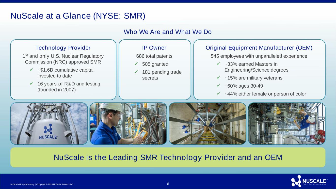 5NuScale Nonproprietary | Copyright © 2023 NuScale Power, LLC. Power for All Humankind Transformational small modular reactor (SMR) provider well- positioned as a first-mover and long-term leader Massive market opportunity to power decarbonized energy transition, expand reliable energy security, and support process heat applications Poised for long-term profitable growth and continued near-term commercial deployment due to new customer and strong pipeline opportunities Significant technology, regulatory, and operational competitive advantages will drive sustainable value creation for the world and shareholders