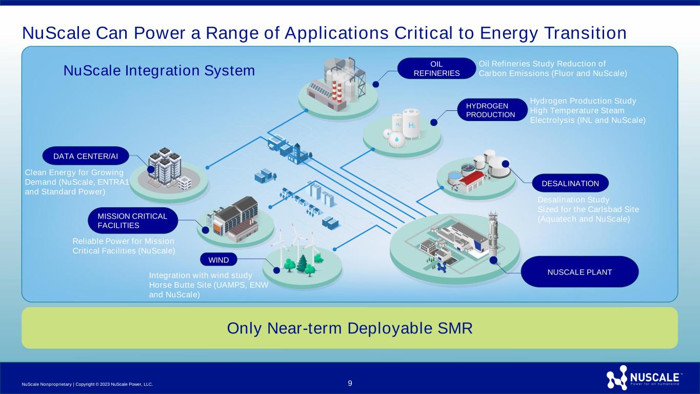 8NuScale Nonproprietary | Copyright © 2023 NuScale Power, LLC. Transition Requires Massive Increase in Carbon-Free Capacity Additions for Electricity Needs Alone Established Leader in Capturing Attractive SMR Addressable Market Opportunity • Expected to capture a meaningful portion of the growth in baseload generation capacity How We’re Well Positioned New Nuclear Industry Trends • SMR first-to-market advantage with mature regulatory, technology and manufacturing readiness • Attractive design features that provide best-in-class flexibility, safety and cost effectiveness • SMRs likely to account for about 1/3 of all nuclear new builds
