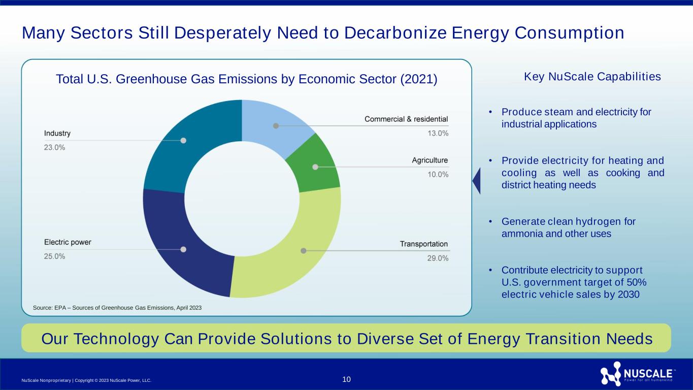 9NuScale Nonproprietary | Copyright © 2023 NuScale Power, LLC. Only Near-term Deployable SMR NuScale Can Power a Range of Applications Critical to Energy Transition OIL REFINERIES Oil Refineries Study Reduction of Carbon Emissions (Fluor and NuScale) HYDROGEN PRODUCTION Hydrogen Production Study High Temperature Steam Electrolysis (INL and NuScale) DESALINATION Desalination Study Sized for the Carlsbad Site (Aquatech and NuScale) NUSCALE PLANT WIND Integration with wind study Horse Butte Site (UAMPS, ENW and NuScale) MISSION CRITICAL FACILITIES Reliable Power for Mission Critical Facilities (NuScale) DATA CENTER/AI Clean Energy for Growing Demand (NuScale, ENTRA1 and Standard Power) NuScale Integration System