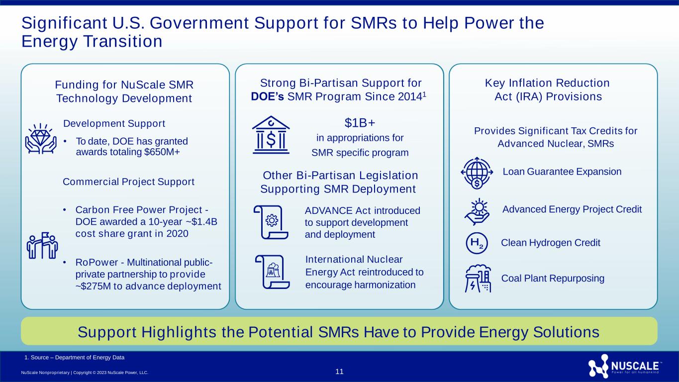 10NuScale Nonproprietary | Copyright © 2023 NuScale Power, LLC. Many Sectors Still Desperately Need to Decarbonize Energy Consumption Our Technology Can Provide Solutions to Diverse Set of Energy Transition Needs Total U.S. Greenhouse Gas Emissions by Economic Sector (2021) Source: EPA – Sources of Greenhouse Gas Emissions, April 2023 Key NuScale Capabilities • Produce steam and electricity for industrial applications • Provide electricity for heating and cooling as well as cooking and district heating needs • Generate clean hydrogen for ammonia and other uses • Contribute electricity to support U.S. government target of 50% electric vehicle sales by 2030