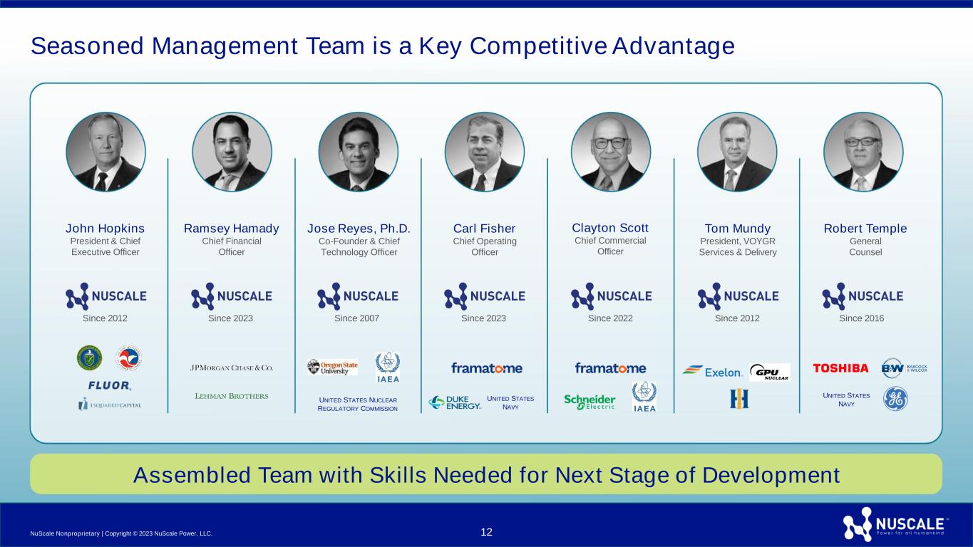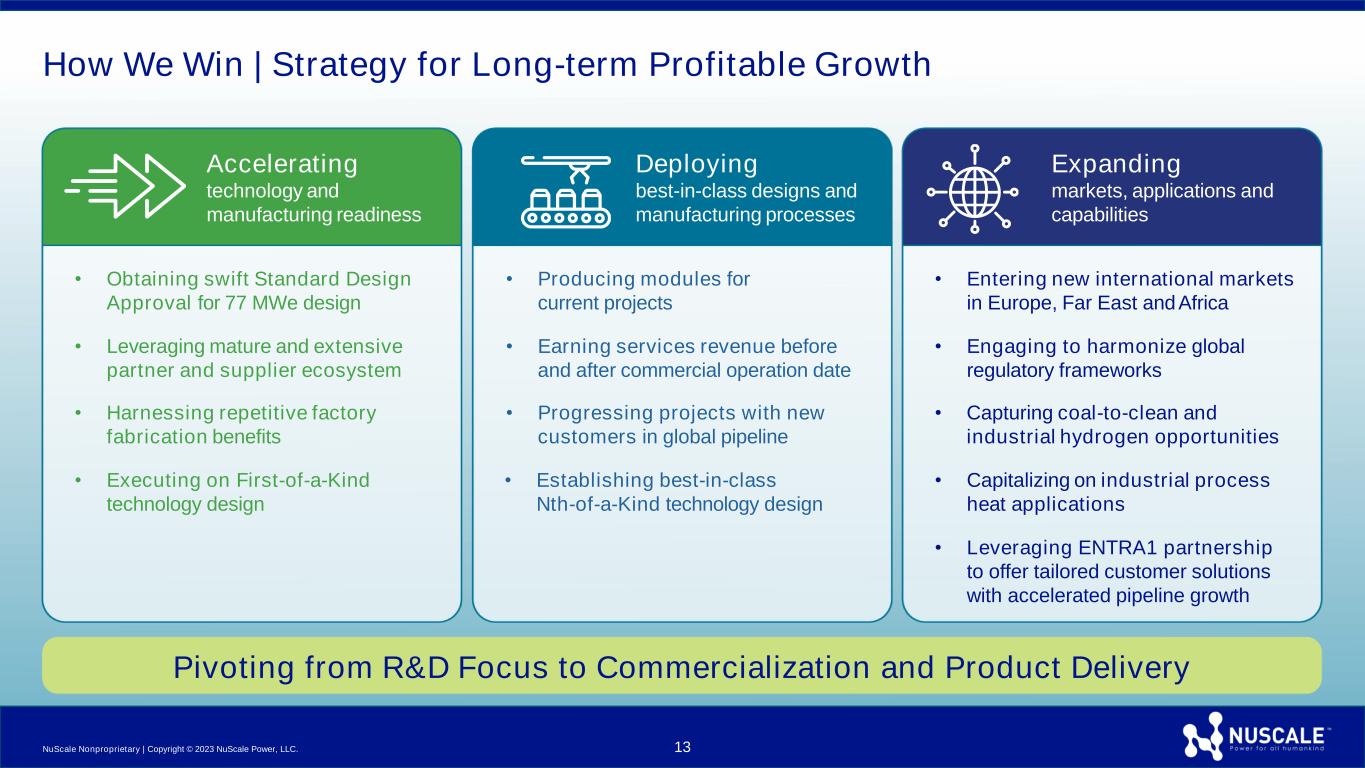 12NuScale Nonproprietary | Copyright © 2023 NuScale Power, LLC. Assembled Team with Skills Needed for Next Stage of Development Seasoned Management Team is a Key Competitive Advantage John Hopkins President & Chief Executive Officer Since 2012 Ramsey Hamady Chief Financial Officer Since 2023 UNITED STATES NUCLEAR REGULATORY COMMISSION Since 2007 Since 2023 Since 2022 Since 2012 Since 2016 Jose Reyes, Ph.D. Co-Founder & Chief Technology Officer Carl Fisher Chief Operating Officer Tom Mundy President, VOYGR Services & Delivery Robert Temple General Counsel Clayton Scott Chief Commercial Officer UNITED STATES NAVY UNITED STATES NAVY