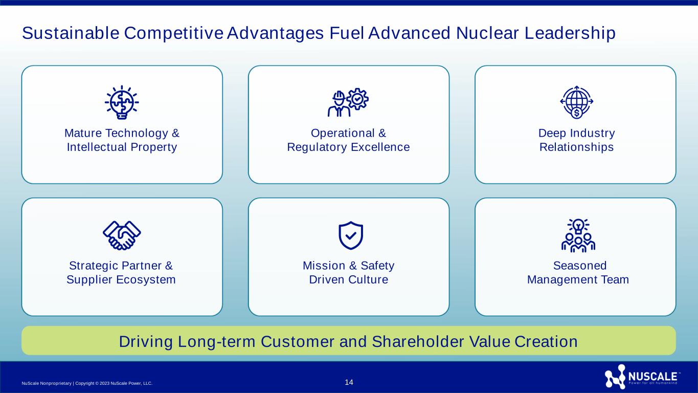13NuScale Nonproprietary | Copyright © 2023 NuScale Power, LLC. Pivoting from R&D Focus to Commercialization and Product Delivery How We Win | Strategy for Long-term Profitable Growth Accelerating technology and manufacturing readiness Deploying best-in-class designs and manufacturing processes Expanding markets, applications and capabilities • Producing modules for current projects • Earning services revenue before and after commercial operation date • Progressing projects with new customers in global pipeline • Establishing best-in-class Nth-of-a-Kind technology design • Obtaining swift Standard Design Approval for 77 MWe design • Leveraging mature and extensive partner and supplier ecosystem • Harnessing repetitive factory fabrication benefits • Executing on First-of-a-Kind technology design • Entering new international markets in Europe, Far East andAfrica • Engaging to harmonize global regulatory frameworks • Capitalizing on industrial process heat applications • Capturing coal-to-clean and industrial hydrogen opportunities • Leveraging ENTRA1 partnership to offer tailored customer solutions with accelerated pipeline growth