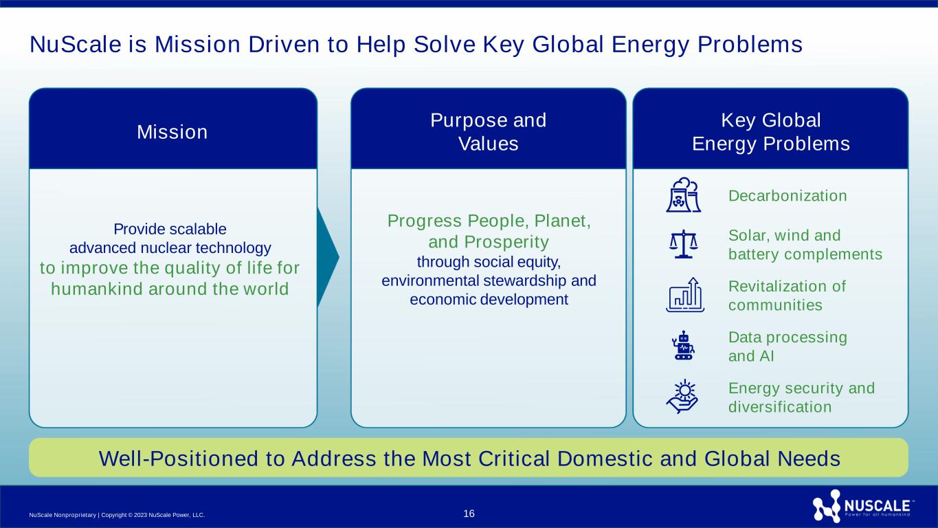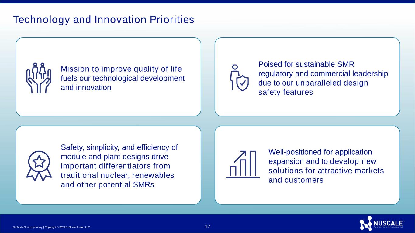 16NuScale Nonproprietary | Copyright © 2023 NuScale Power, LLC. NuScale is Mission Driven to Help Solve Key Global Energy Problems Well-Positioned to Address the Most Critical Domestic and Global Needs Provide scalable advanced nuclear technology to improve the quality of life for humankind around the world Progress People, Planet, and Prosperity through social equity, environmental stewardship and economic development Mission Purpose and Values Key Global Energy Problems Decarbonization Data processing and AI Energy security and diversification Solar, wind and battery complements Revitalization of communities