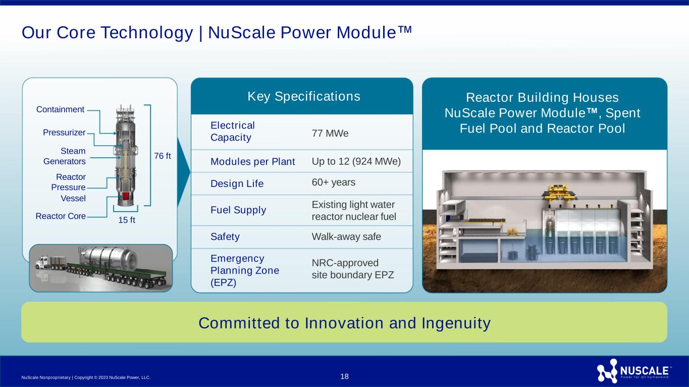17NuScale Nonproprietary | Copyright © 2023 NuScale Power, LLC. Technology and Innovation Priorities Mission to improve quality of life fuels our technological development and innovation Poised for sustainable SMR regulatory and commercial leadership due to our unparalleled design safety features Safety, simplicity, and efficiency of module and plant designs drive important differentiators from traditional nuclear, renewables and other potential SMRs Well-positioned for application expansion and to develop new solutions for attractive markets and customers