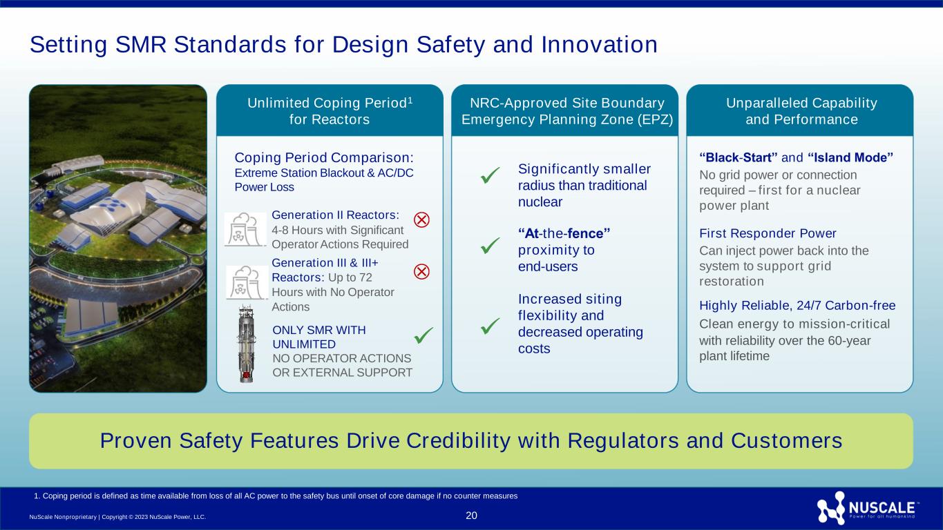 19NuScale Nonproprietary | Copyright © 2023 NuScale Power, LLC. Unparalleled Safety and Demonstration ✓ 67 years of civilian and naval operational experience ✓ Used in more than 350 commercial reactors globally, and 83 nuclear- powered ships ✓ Natural circulation with light water pressurized and packaged in a small integral reactor vessel ✓ Well-known, commercially and economically available low- enriched uranium dioxide fuel Best-in-Class Data Quality and Risk Assessment Validations Proven Light Water Reactor (LWR) Technology $150M+ Expended on State-of-the-Art Test Programs and Demonstrations