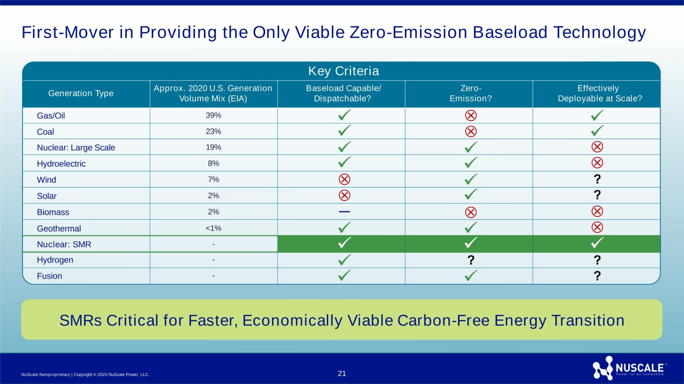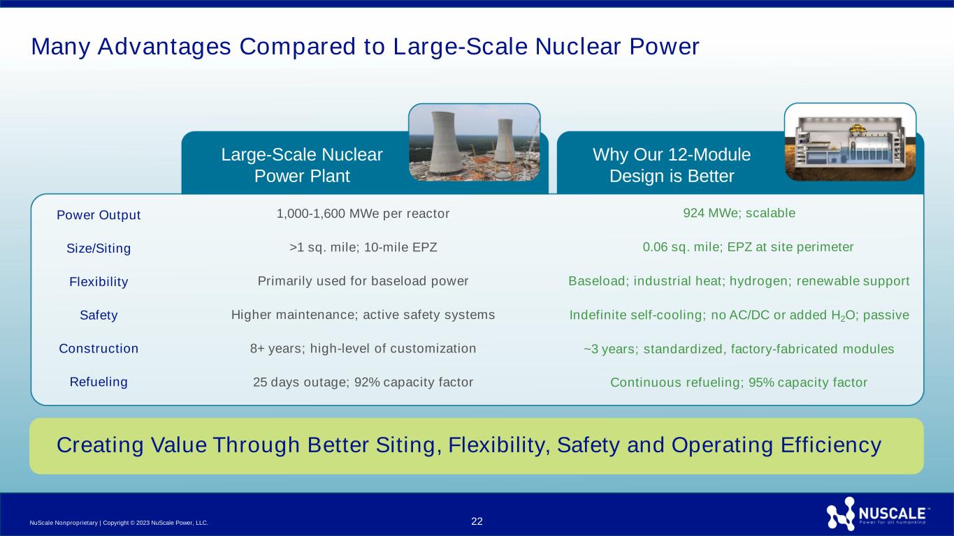 21NuScale Nonproprietary | Copyright © 2023 NuScale Power, LLC. First-Mover in Providing the Only Viable Zero-Emission Baseload Technology Generation Type Approx. 2020 U.S. Generation Volume Mix (EIA) Baseload Capable/ Dispatchable? Zero- Emission? Effectively Deployable at Scale? Gas/Oil Coal Nuclear: Large Scale Hydroelectric Wind Solar Biomass Geothermal Nuclear: SMR Hydrogen Fusion 39% 23% 8% 7% 2% 2% <1% - - - 19% SMRs Critical for Faster, Economically Viable Carbon-Free Energy Transition Key Criteria