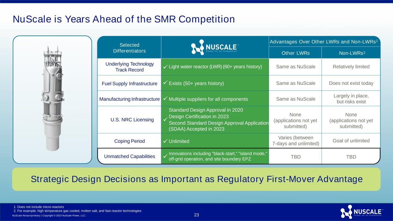 22NuScale Nonproprietary | Copyright © 2023 NuScale Power, LLC. Large-Scale Nuclear Power Plant Why Our 12-Module Design is Better Creating Value Through Better Siting, Flexibility, Safety and Operating Efficiency Indefinite self-cooling; no AC/DC or added H2O; passive Baseload; industrial heat; hydrogen; renewable support 1,000-1,600 MWe per reactor 924 MWe; scalable ~3 years; standardized, factory-fabricated modules Continuous refueling; 95% capacity factor 0.06 sq. mile; EPZ at site perimeter>1 sq. mile; 10-mile EPZ Higher maintenance; active safety systems 8+ years; high-level of customization Primarily used for baseload power 25 days outage; 92% capacity factor Power Output Size/Siting Flexibility Safety Construction Refueling Many Advantages Compared to Large-Scale Nuclear Power