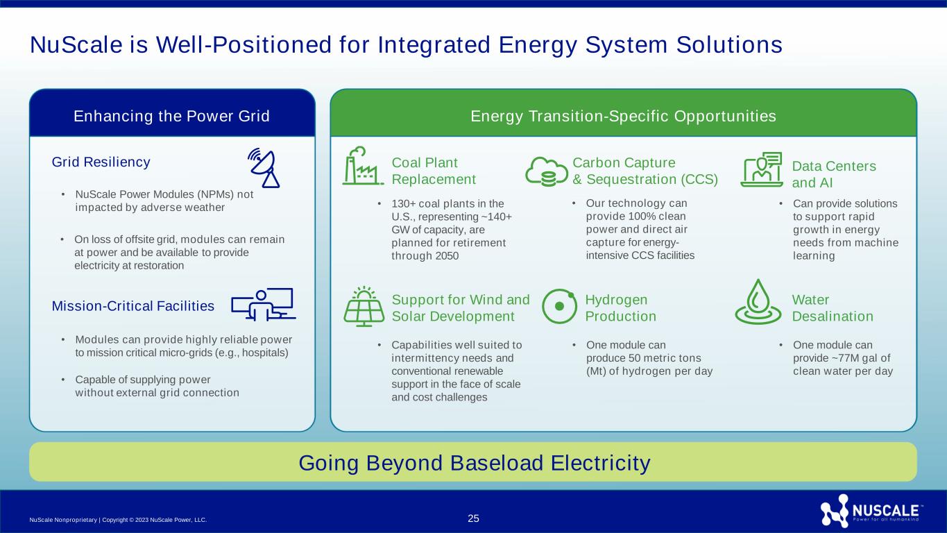 24NuScale Nonproprietary | Copyright © 2023 NuScale Power, LLC. Key Competitive Advantage | NRC-Approved Emergency Planning Zone Strong regulatory advantages over other SMRs • Engaged with NRC on rule for advanced nuclear emergency preparedness • Completed all requirements to obtain approval (took ~7 years) • Process to obtain approval is rigorous and time consuming • Must have NRC-approved methodology to achieve site- boundary EPZ Pre-determined protective action plans a must for large publicly accessible areas Williams Power Station (Coal, 650 MW), S. Carolina Announced retirement date of 2028 Only SMR with NRC-Approved Proprietary Method for Calculating Site-Boundary EPZ