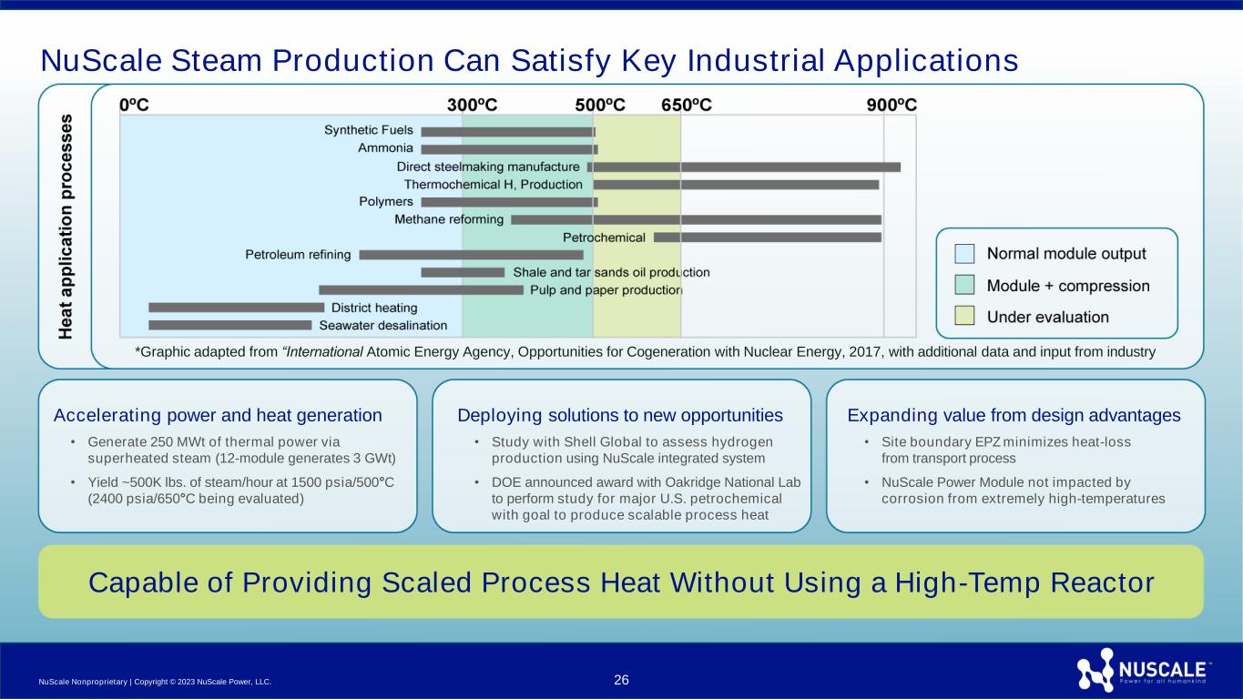 25NuScale Nonproprietary | Copyright © 2023 NuScale Power, LLC. NuScale is Well-Positioned for Integrated Energy System Solutions Going Beyond Baseload Electricity Enhancing the Power Grid Energy Transition-Specific Opportunities Grid Resiliency • NuScale Power Modules (NPMs) not impacted by adverse weather • On loss of offsite grid, modules can remain at power and be available to provide electricity at restoration Mission-Critical Facilities • Modules can provide highly reliable power to mission critical micro-grids (e.g., hospitals) • Capable of supplying power without external grid connection Coal Plant Replacement • 130+ coal plants in the U.S., representing ~140+ GW of capacity, are planned for retirement through 2050 Support for Wind and Solar Development • Capabilities well suited to intermittency needs and conventional renewable support in the face of scale and cost challenges Carbon Capture & Sequestration (CCS) • Our technology can provide 100% clean power and direct air capture for energy- intensive CCS facilities Hydrogen Production • One module can produce 50 metric tons (Mt) of hydrogen per day Water Desalination Data Centers and AI • Can provide solutions to support rapid growth in energy needs from machine learning • One module can provide ~77M gal of clean water per day
