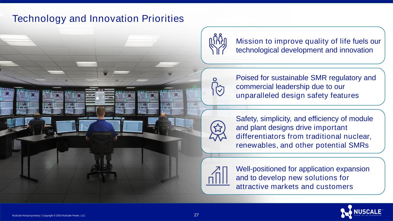 27NuScale Nonproprietary | Copyright © 2023 NuScale Power, LLC. Technology and Innovation Priorities Mission to improve quality of life fuels our technological development and innovation Poised for sustainable SMR regulatory and commercial leadership due to our unparalleled design safety features Safety, simplicity, and efficiency of module and plant designs drive important differentiators from traditional nuclear, renewables, and other potential SMRs Well-positioned for application expansion and to develop new solutions for attractive markets and customers