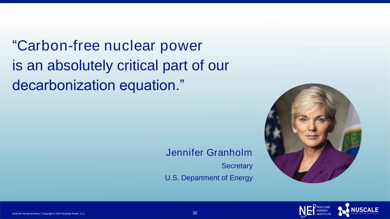 30NuScale Nonproprietary | Copyright © 2023 NuScale Power, LLC. “Carbon-free nuclear power is an absolutely critical part of our decarbonization equation.” Jennifer Granholm Secretary U.S. Department of Energy