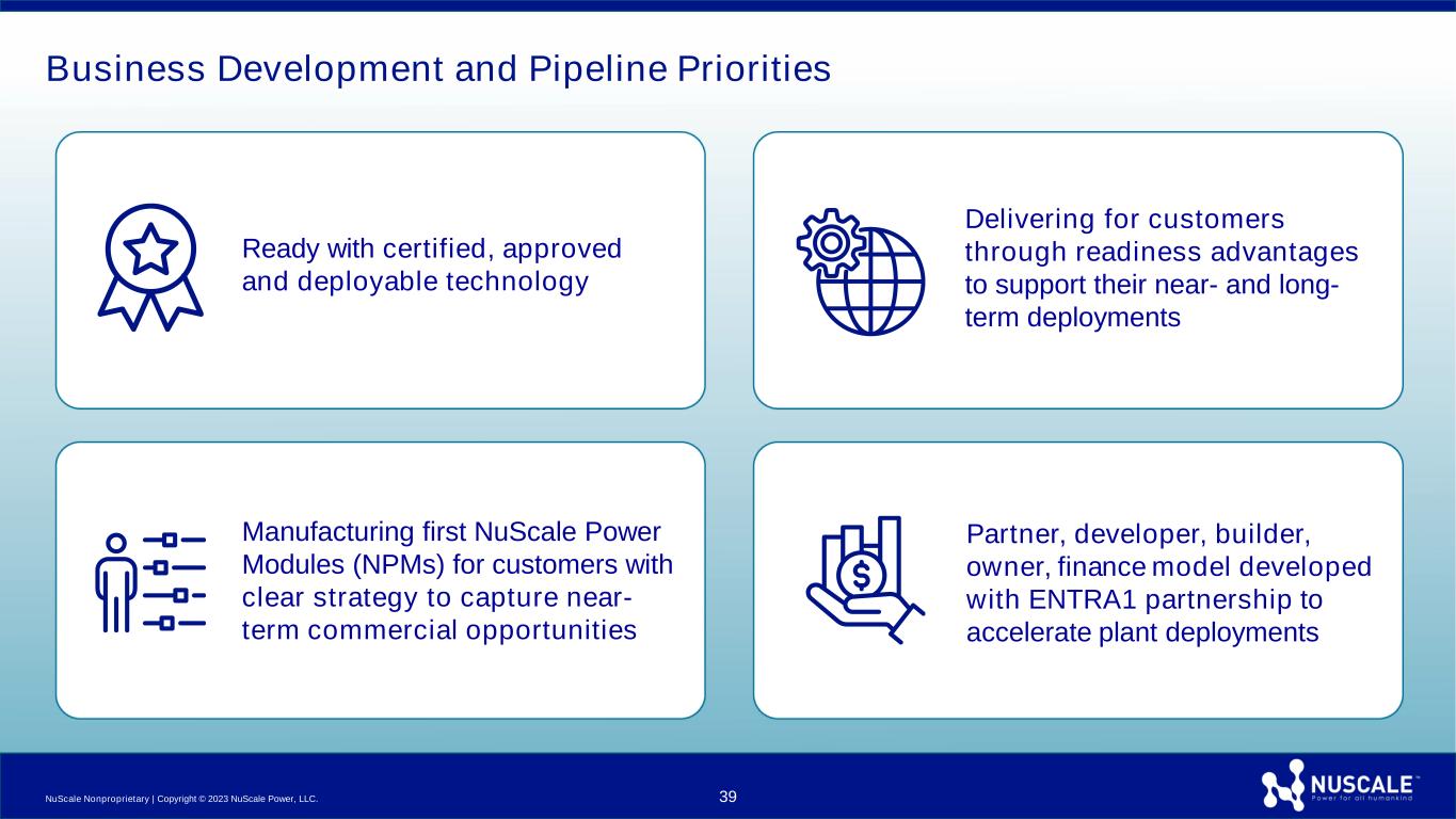 39NuScale Nonproprietary | Copyright © 2023 NuScale Power, LLC. Business Development and Pipeline Priorities Ready with certified, approved and deployable technology Delivering for customers through readiness advantages to support their near- and long- term deployments Manufacturing first NuScale Power Modules (NPMs) for customers with clear strategy to capture near- term commercial opportunities Partner, developer, builder, owner, finance model developed with ENTRA1 partnership to accelerate plant deployments