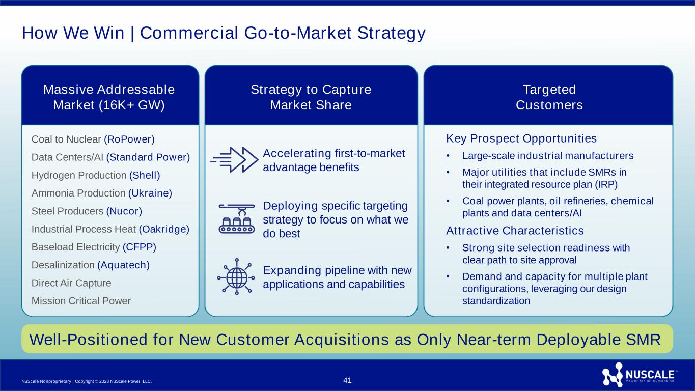 40NuScale Nonproprietary | Copyright © 2023 NuScale Power, LLC. Blazing the Trail to Commercialization Positioned as SMR Technology Market Leader Over Near- and Long-term Standard design with scalable size and output Best-in-class product features for customers First-mover advantage in highly coveted U.S. and international markets Ongoing relative regulatory and deployment progress Well-Positioned to Compete