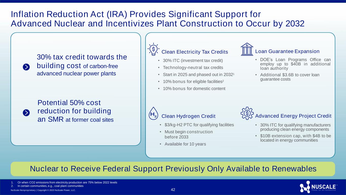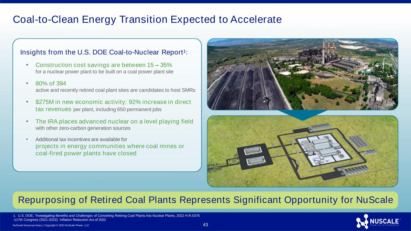 42NuScale Nonproprietary | Copyright © 2023 NuScale Power, LLC. Inflation Reduction Act (IRA) Provides Significant Support for Advanced Nuclear and Incentivizes Plant Construction to Occur by 2032 Nuclear to Receive Federal Support Previously Only Available to Renewables 30% tax credit towards the building cost of carbon-free advanced nuclear power plants Potential 50% cost reduction for building an SMR at former coal sites 1. Or when CO2 emissions from electricity production are 75% below 2022 levels 2. In certain communities, e.g., coal plant communities Clean Electricity Tax Credits • 30% ITC (investment tax credit) • Technology-neutral tax credits • Start in 2025 and phased out in 20321 • 10% bonus for eligible facilities2 • 10% bonus for domestic content Loan Guarantee Expansion • DOE’s Loan Programs Office can employ up to $40B in additional loan authority • Additional $3.6B to cover loan guarantee costs Advanced Energy Project Credit • 30% ITC for qualifying manufacturers producing clean energy components • $10B extension cap, with $4B to be located in energy communities Clean Hydrogen Credit • $3/kg-H2 PTC for qualifying facilities • Must begin construction before 2033 • Available for 10 years