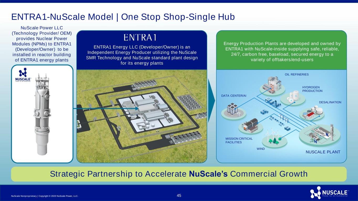 46NuScale Nonproprietary | Copyright © 2023 NuScale Power, LLC. ENTRA1 Has Robust Global Pipeline of Energy Plants, Powered By Our Technology Providing a Single Hub Solution to Meet Growing Consumer Energy Demand Development and Financing ENTRA1 develops and finances, while a plant is owned and operated by a utility company ENTRA1 entitled to developer fee and royalties throughout plant life ENTRA1 Provides Bespoke Structures to Meet the Unique Needs of Energy Consumers and Purchasers Build, Own, Operate (BOO) ENTRA1 owns and operates with energy sold under a long-term power purchase agreement (PPA) to an off-taker and to the spot market after the PPA term Build, Operate, Transfer (BOT) ENTRA1 owns, but operations are transferred to a utility company under a long-term operating lease TECHNOLOGY FINANCING OWNERSHIP OPERATION DEVELOPMENT/ EXECUTION POWER PRODUCTION HYDROGEN PRODUCTION WATER DESALINATION JOB CREATION LOCALIZATION ENERGY INDEPENDENCE DECARBONIZATION/ SUSTAINBILITY ECONOMIC IMPACT Exclusive Global Strategic Partner for Commercialization and Development of Energy Plants with NuScale SMR Technology