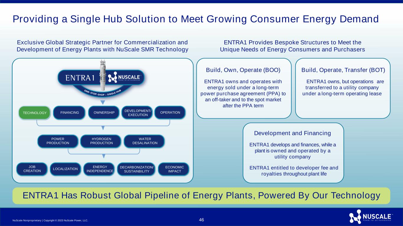45NuScale Nonproprietary | Copyright © 2023 NuScale Power, LLC. ENTRA1-NuScale Model | One Stop Shop-Single Hub NuScale Power LLC (Technology Provider/ OEM) provides Nuclear Power Modules (NPMs) to ENTRA1 (Developer/Owner) to be installed in reactor building of ENTRA1 energy plants ENTRA1 Energy LLC (Developer/Owner) is an Independent Energy Producer utilizing the NuScale SMR Technology and NuScale standard plant design for its energy plants Energy Production Plants are developed and owned by ENTRA1 with NuScale-inside supplying safe, reliable, 24/7, carbon free, baseload, secured energy to a variety of offtakers/end-users Strategic Partnership to Accelerate NuScale’s Commercial Growth OIL REFINERIES HYDROGEN PRODUCTION DESALINATION NUSCALE PLANT WIND MISSION CRITICAL FACILITIES DATA CENTER/AI