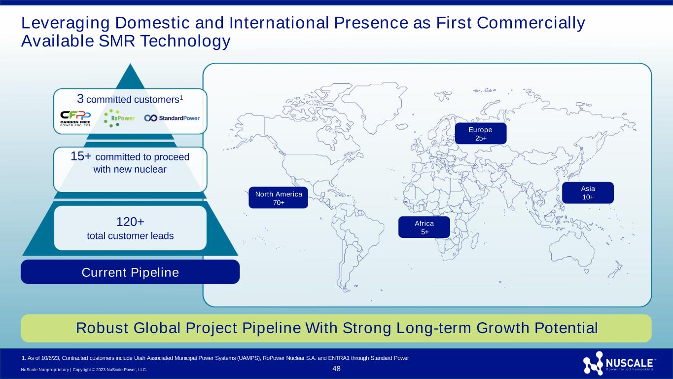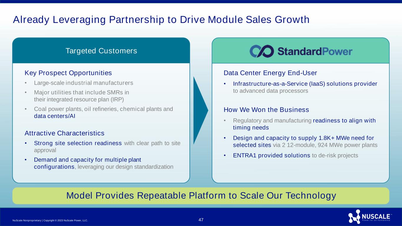 47NuScale Nonproprietary | Copyright © 2023 NuScale Power, LLC. Model Provides Repeatable Platform to Scale Our Technology Already Leveraging Partnership to Drive Module Sales Growth Targeted Customers Data Center Energy End-User • Infrastructure-as-a-Service (IaaS) solutions provider to advanced data processors How We Won the Business • Regulatory and manufacturing readiness to align with timing needs • Design and capacity to supply 1.8K+ MWe need for selected sites via 2 12-module, 924 MWe power plants • ENTRA1 provided solutions to de-risk projects Key Prospect Opportunities • Large-scale industrial manufacturers • Major utilities that include SMRs in their integrated resource plan (IRP) • Coal power plants, oil refineries, chemical plants and data centers/AI Attractive Characteristics • Strong site selection readiness with clear path to site approval • Demand and capacity for multiple plant configurations, leveraging our design standardization