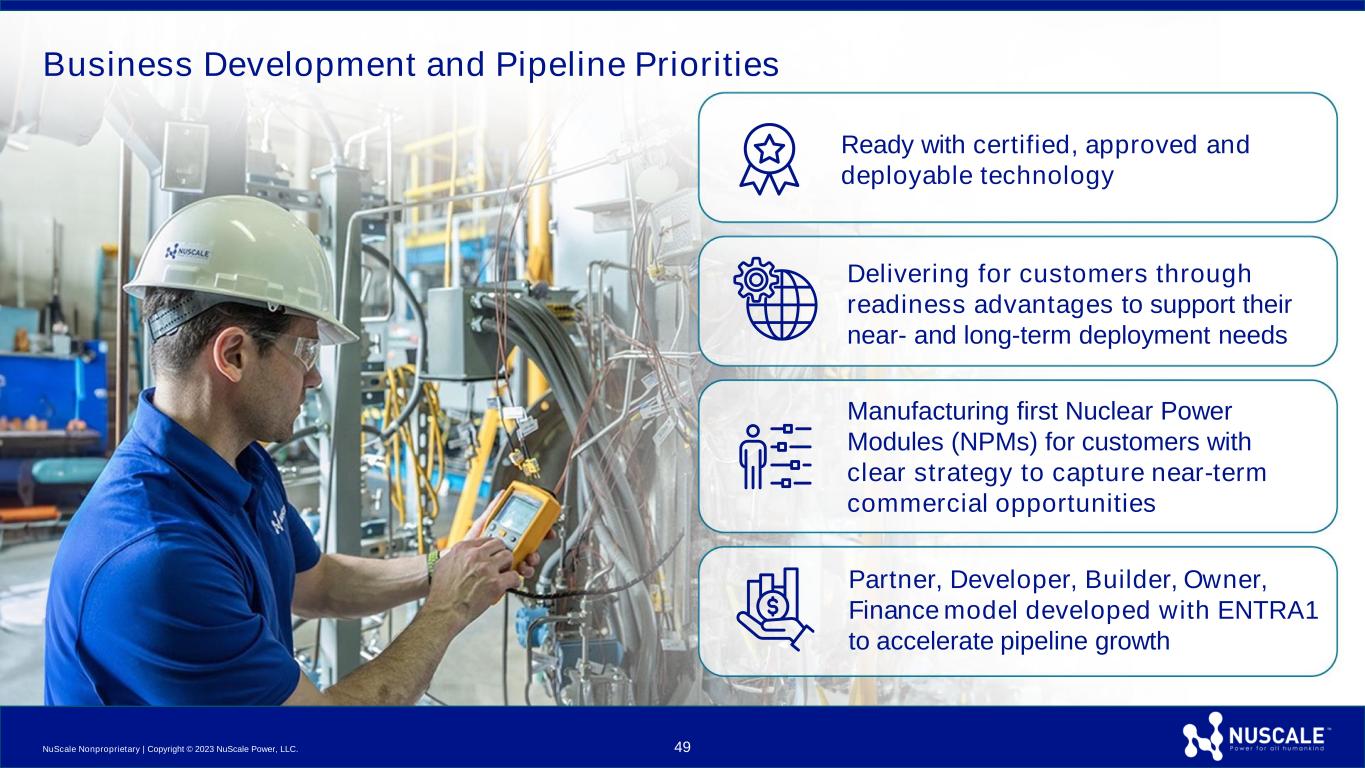 48NuScale Nonproprietary | Copyright © 2023 NuScale Power, LLC. Robust Global Project Pipeline With Strong Long-term Growth Potential Leveraging Domestic and International Presence as First Commercially Available SMR Technology North America 70+ Europe 25+ Africa 5+ 120+ total customer leads Asia 10+ 15+ committed to proceed with new nuclear 3 committed customers1 Current Pipeline 1. As of 10/6/23, Contracted customers include Utah Associated Municipal Power Systems (UAMPS), RoPower Nuclear S.A. and ENTRA1 through Standard Power