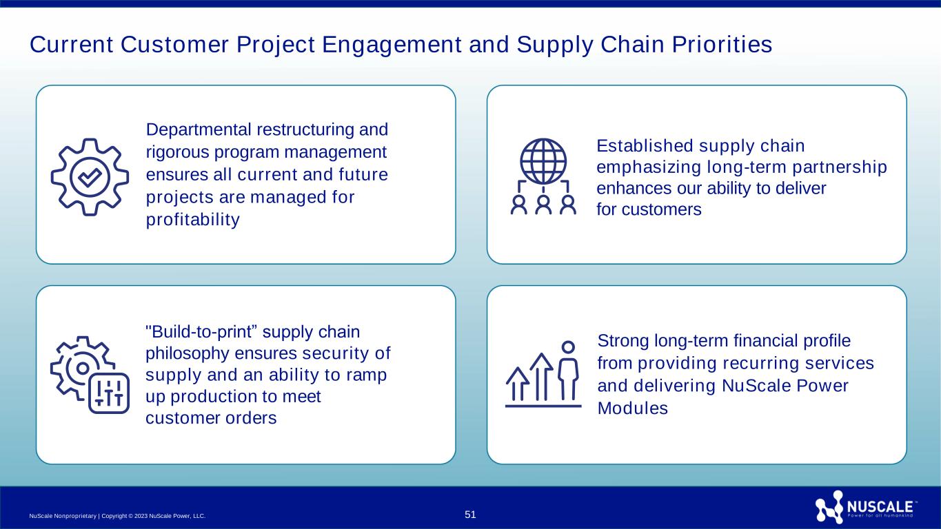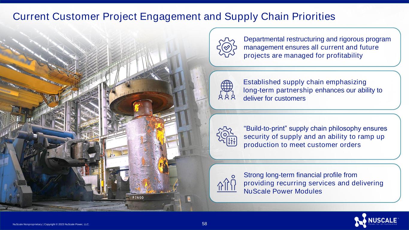 58NuScale Nonproprietary | Copyright © 2023 NuScale Power, LLC. Current Customer Project Engagement and Supply Chain Priorities Departmental restructuring and rigorous program management ensures all current and future projects are managed for profitability Established supply chain emphasizing long-term partnership enhances our ability to deliver for customers "Build-to-print” supply chain philosophy ensures security of supply and an ability to ramp up production to meet customer orders Strong long-term financial profile from providing recurring services and delivering NuScale Power Modules