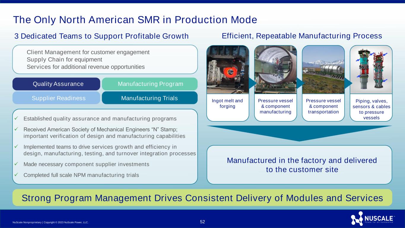 51NuScale Nonproprietary | Copyright © 2023 NuScale Power, LLC. Current Customer Project Engagement and Supply Chain Priorities Departmental restructuring and rigorous program management ensures all current and future projects are managed for profitability Established supply chain emphasizing long-term partnership enhances our ability to deliver for customers "Build-to-print” supply chain philosophy ensures security of supply and an ability to ramp up production to meet customer orders Strong long-term financial profile from providing recurring services and delivering NuScale Power Modules