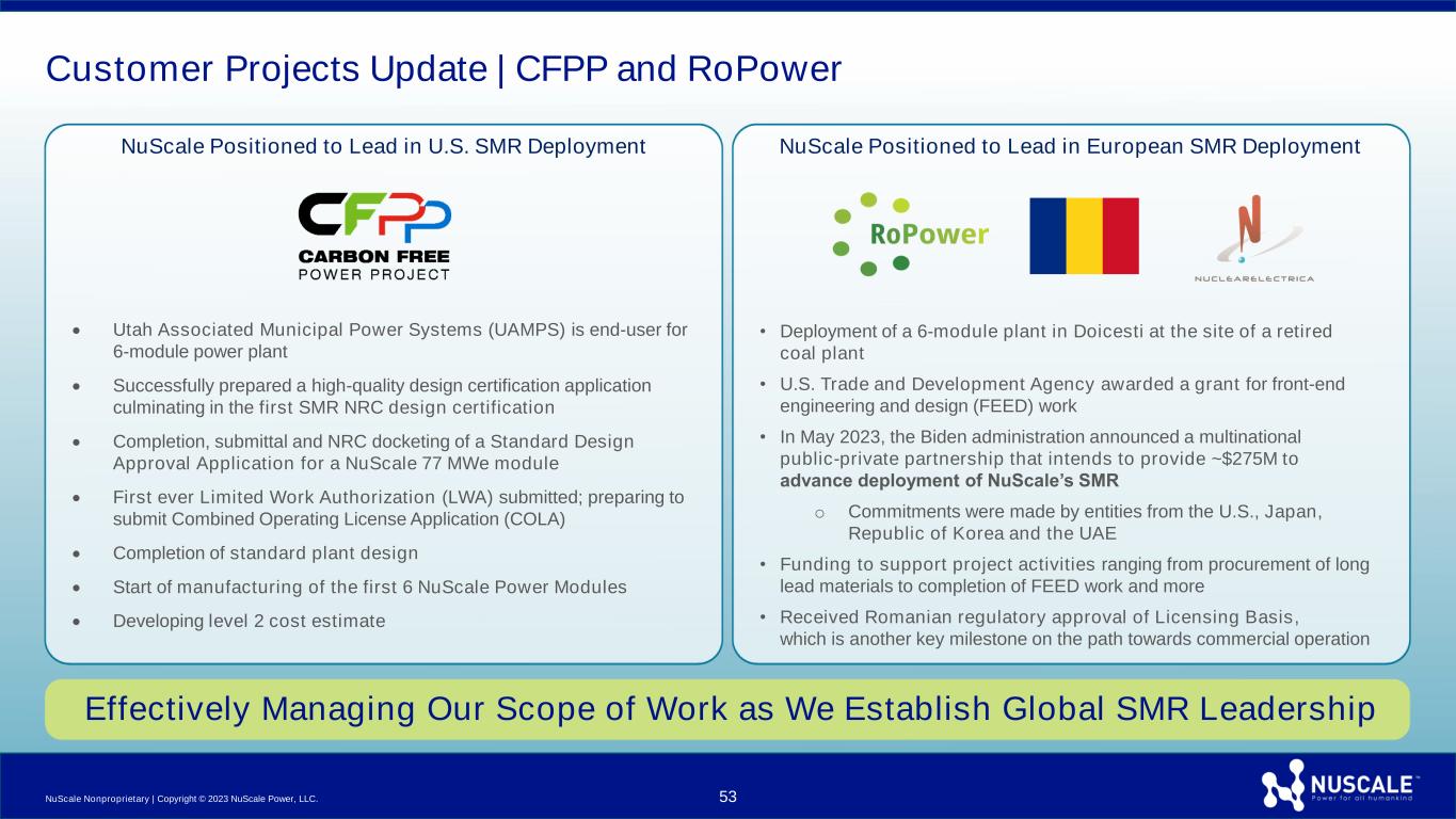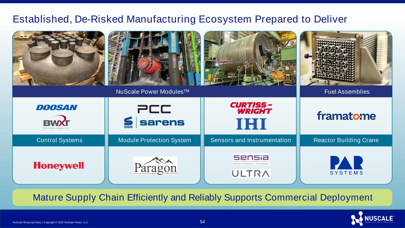 53NuScale Nonproprietary | Copyright © 2023 NuScale Power, LLC. Customer Projects Update | CFPP and RoPower • Utah Associated Municipal Power Systems (UAMPS) is end-user for 6-module power plant • Successfully prepared a high-quality design certification application culminating in the first SMR NRC design certification • Completion, submittal and NRC docketing of a Standard Design Approval Application for a NuScale 77 MWe module • First ever Limited Work Authorization (LWA) submitted; preparing to submit Combined Operating License Application (COLA) • Completion of standard plant design • Start of manufacturing of the first 6 NuScale Power Modules • Developing level 2 cost estimate Effectively Managing Our Scope of Work as We Establish Global SMR Leadership • Deployment of a 6-module plant in Doicesti at the site of a retired coal plant • U.S. Trade and Development Agency awarded a grant for front-end engineering and design (FEED) work • In May 2023, the Biden administration announced a multinational public-private partnership that intends to provide ~$275M to advance deployment of NuScale’s SMR o Commitments were made by entities from the U.S., Japan, Republic of Korea and the UAE • Funding to support project activities ranging from procurement of long lead materials to completion of FEED work and more • Received Romanian regulatory approval of Licensing Basis, which is another key milestone on the path towards commercial operation NuScale Positioned to Lead in U.S. SMR Deployment NuScale Positioned to Lead in European SMR Deployment