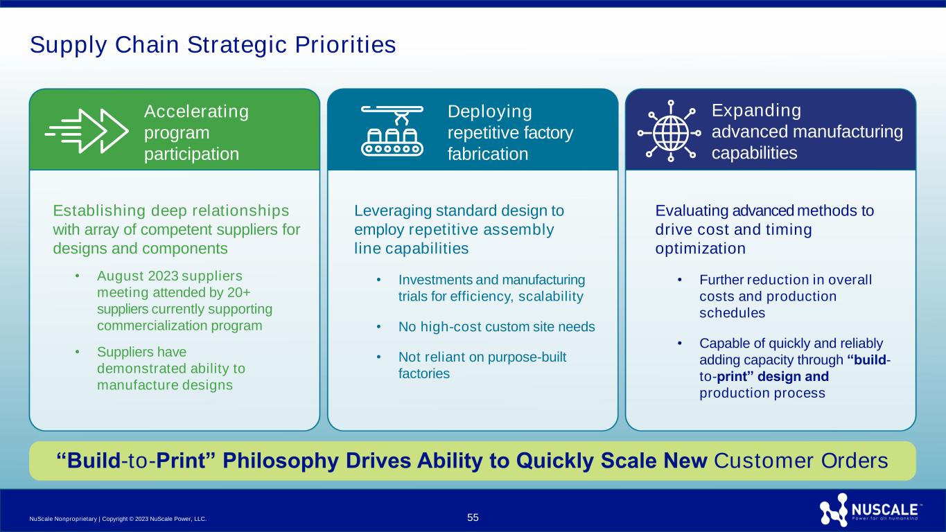 54NuScale Nonproprietary | Copyright © 2023 NuScale Power, LLC. Established, De-Risked Manufacturing Ecosystem Prepared to Deliver Mature Supply Chain Efficiently and Reliably Supports Commercial Deployment NuScale Power ModulesTM Fuel Assemblies Control Systems Module Protection System Sensors and Instrumentation Reactor Building Crane