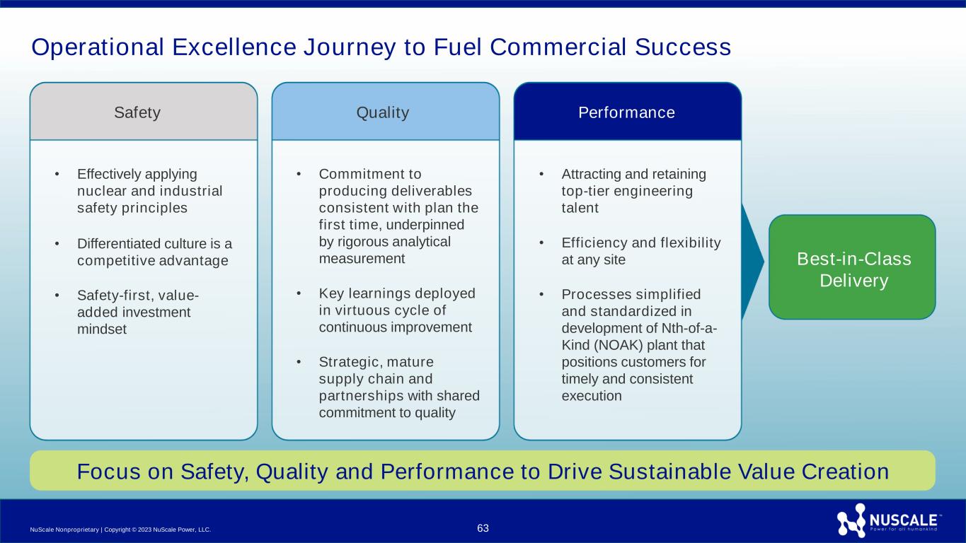62NuScale Nonproprietary | Copyright © 2023 NuScale Power, LLC. Operational Excellence and Readiness Priorities Operational excellence philosophy fuels execution as we transition from R&D to commercialization Our focus on safety, quality, performance and delivery drives regulatory and program management leadership Technology, data, and processes are employed to ensure customer projects are performed efficiently, on schedule and on budget We are well-positioned to offer products and services to our customers