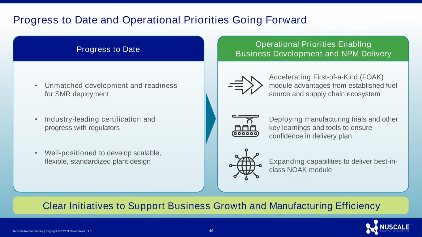 63NuScale Nonproprietary | Copyright © 2023 NuScale Power, LLC. Operational Excellence Journey to Fuel Commercial Success Focus on Safety, Quality and Performance to Drive Sustainable Value Creation • Commitment to producing deliverables consistent with plan the first time, underpinned by rigorous analytical measurement • Key learnings deployed in virtuous cycle of continuous improvement • Strategic, mature supply chain and partnerships with shared commitment to quality • Attracting and retaining top-tier engineering talent • Efficiency and flexibility at any site • Processes simplified and standardized in development of Nth-of-a- Kind (NOAK) plant that positions customers for timely and consistent execution • Effectively applying nuclear and industrial safety principles • Differentiated culture is a competitive advantage • Safety-first, value- added investment mindset Safety Quality Performance Best-in-Class Delivery